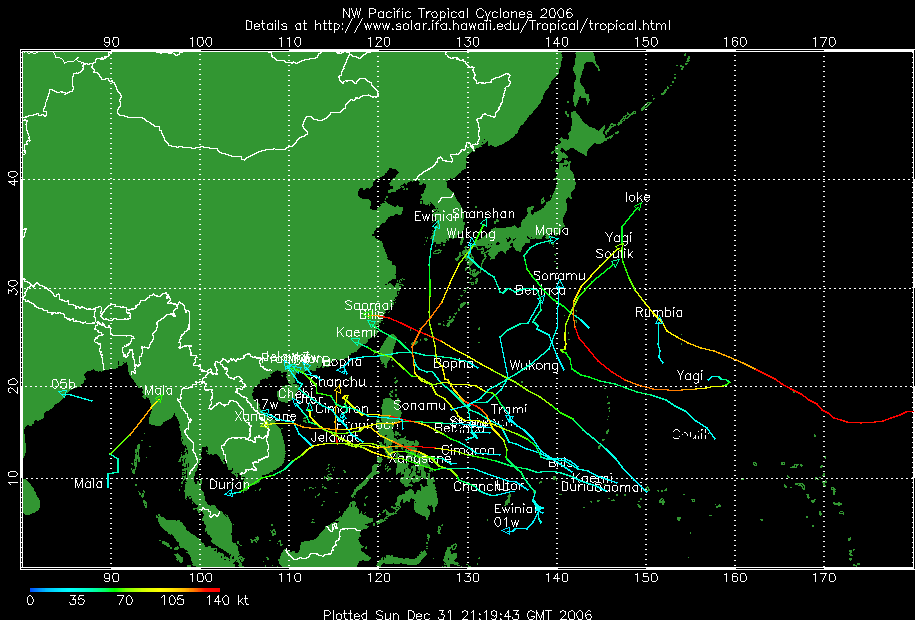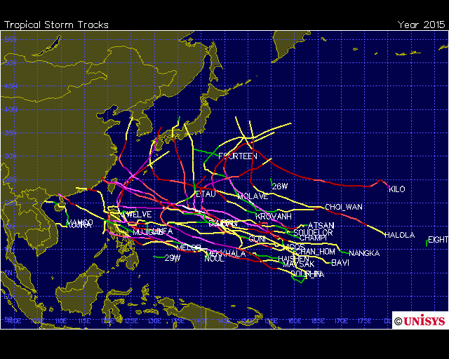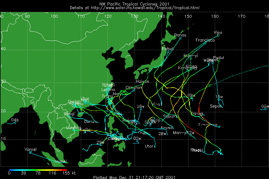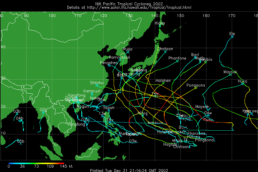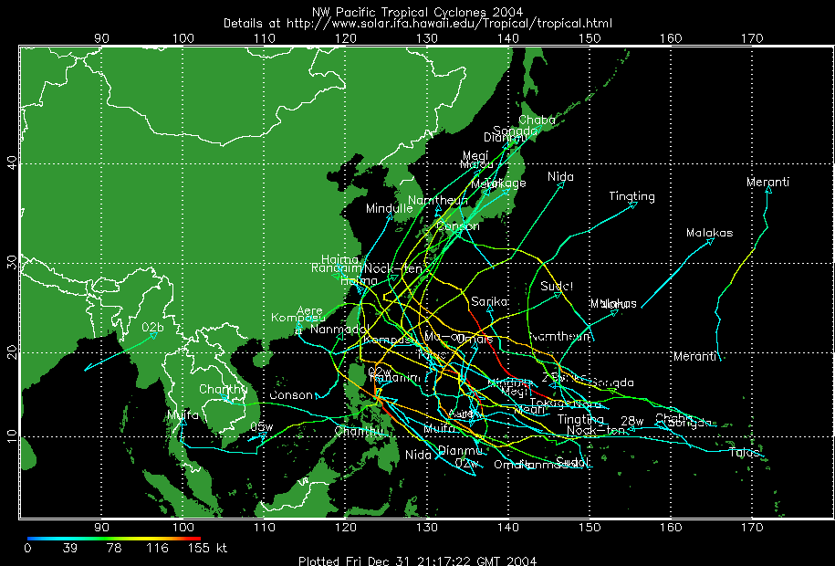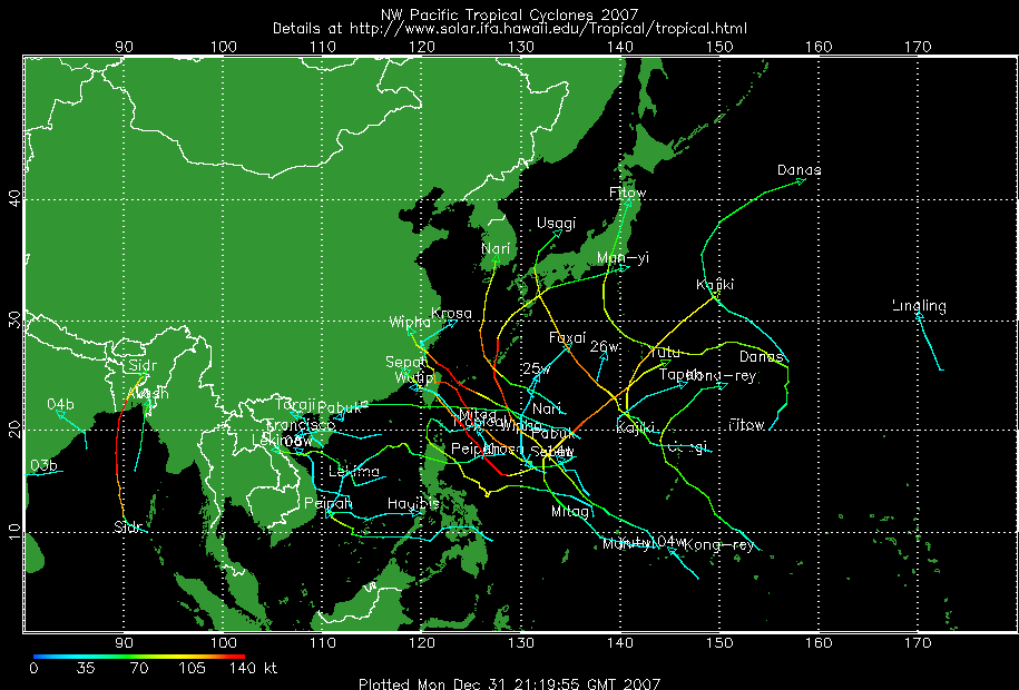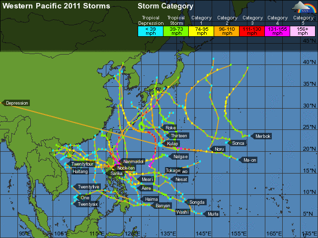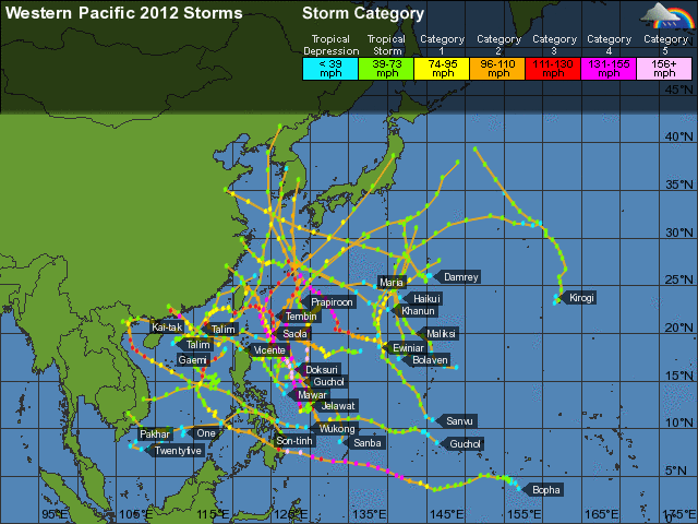 แผนที่วิเคราะห์เส้นทาง และความแรงของพายุ ในมหาสมุทรแปซิฟิก