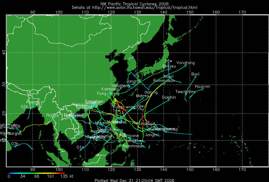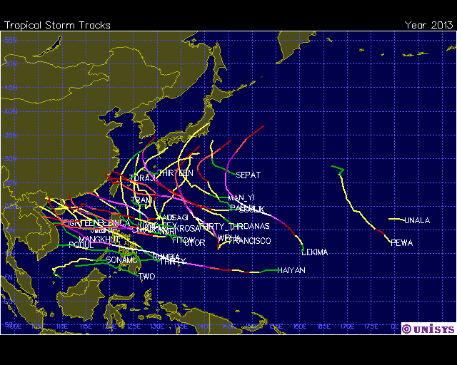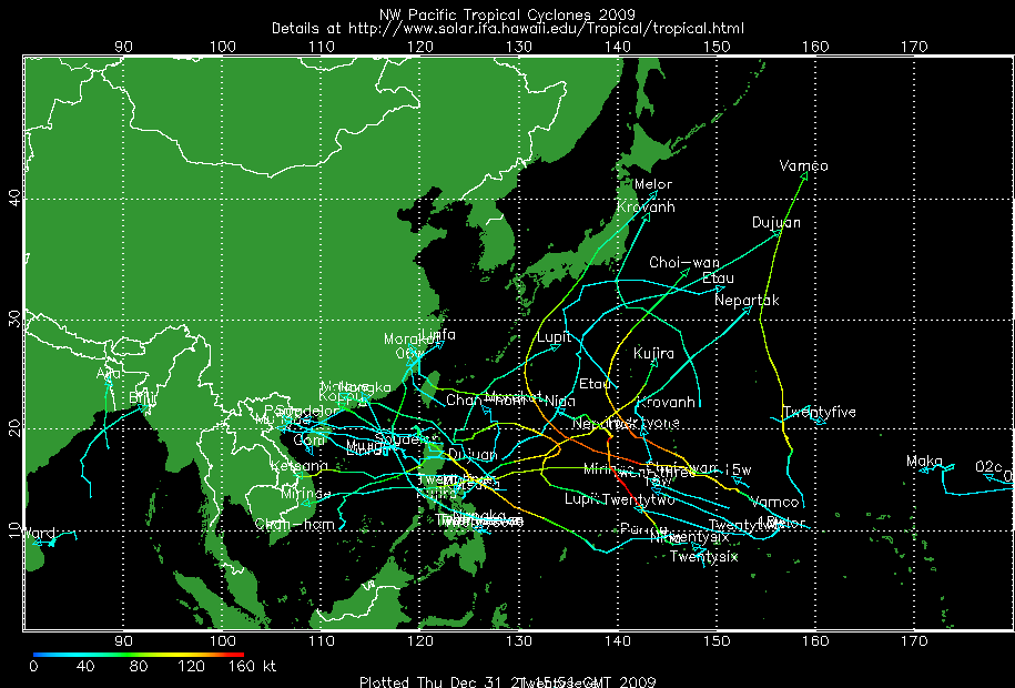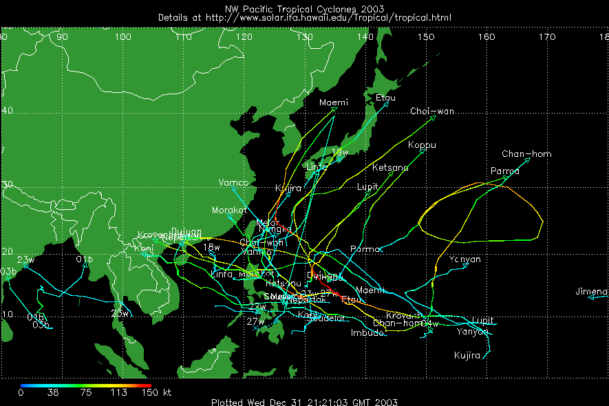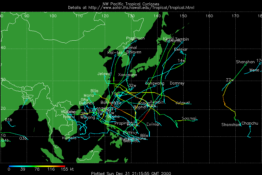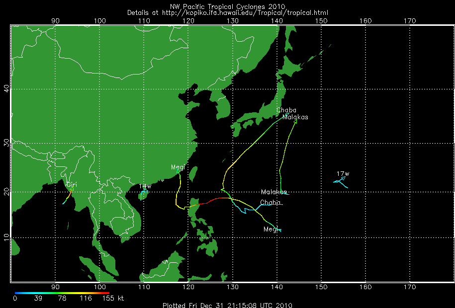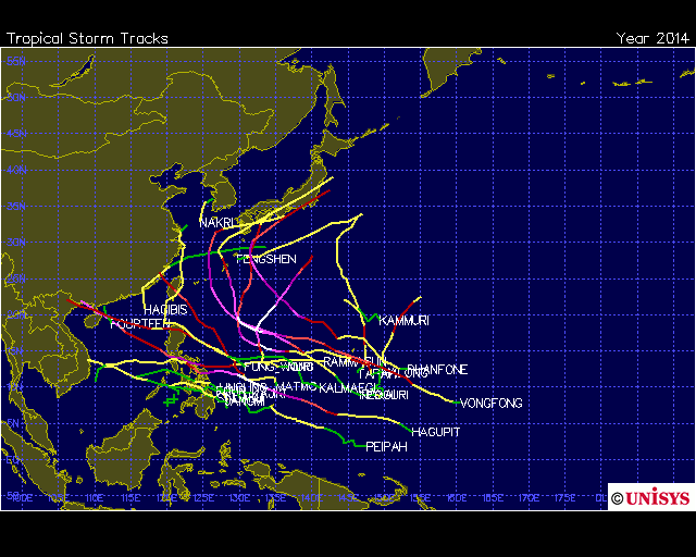 แผนที่วิเคราะห์เส้นทาง และความแรงของพายุ ในมหาสมุทรแปซิฟิก