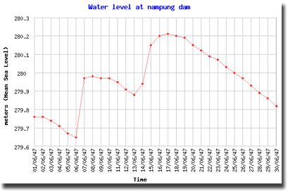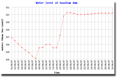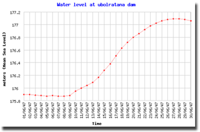 | จากกราฟแสดงระดับน้ำของแต่ละเขื่อนในภาคตะวันออกเฉียงเหนือ จะเห็นได้ว่าระดับน้ำได้เพิ่มสูงขึ้นอย่างรวดเร็วช่วงกลางเดือนมิถุนายน