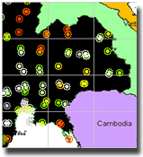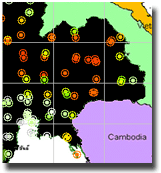 | การติดตามปริมาณฝนที่ตกในพื้นที่ โดยใช้สถิติของการกระจายตัวของน้ำฝนเพื่อวิเคราะห์แนวโน้ม ประยุกต์ ใช้ภาพตรวจอากาศด้วยเรดาห์ และค่าปริมาณฝนที่ตก ซึ่งตรวจวัดโดยสถานีตรวจอากาศของกรมอุตุนิยมวิทยา โดยบริเวณวงกลมสีแดงหมายถึงพื้นที่ที่มีฝนตกหนัก จากภาพจะพบว่าในช่วงวันที่ 14-16 มิถุนายน มีฝนตกชุกในภาค ตะวันออกเฉียงเหนือ และภาคเหนือตอนล่าง โดยเฉพาะในวันที่ 14 มิ.ย.ฝนได้มีฝนตกลงมา อย่างหนักครอบคลุมทุกอำเภอของจังหวัดสุรินทร์ ทำให้เกิดน้ำท่วมขังในหลายพื้นที่ | |||