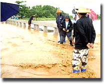 117(นครสวรรค์ -พิษณุโลก)แทน ส่วนที่ อ.วังทรายพูน นายวิทยา อยู่สุข อายุ 25 ปี ถูกฟ้าผ่าเสียชีวิตคาที่เมื่อคืนที่ผ่านมา ขณะเก็บข้าวของอยู่บ้านพัก ที่ จ.พิษณุโลก น้ำป่าไหลเข้าท่วมบ้านเรือนใน ต.หนองพระ อ.วังทอง ทำให้กว่า 500 ครอบครัวต้องขนของหนีน้ำกันจ้าละหวั่นพื้นที่การเกษตรจมอยู่ใต้น่ำกว่า 10,000 ไร่ ร.ร.หนองพระวิทยา ร.ร.แก่งกุลาสามัคคี ร.ร.ป่ามะกรูด ร.ร.บ้านแสงสว่าง และ ร.ร.แก่งกุลาสามัคคี ต้องปิดการเรียนการสอน น้ำยังได้เข้าท่วมเรือนจำจังหวัดพิษณุโลก จนต้องอพยพนักโทษหญิงไปเรือนจำกลางแห่งใหม่ที่เพิ่งก่อสร้างเสร็จ ที่ จ.แม่ฮ่องสอน มีน้ำเข้าท่วมเขต อ.ปางมะผ้า ทำให้สถานีทดลองข้าวแม่ฮ่องสอนเสียหายอย่างหนัก ส่วนที่ ต.ถ้ำลอด เกสต์เฮาส์ที่อยู่ใกล้แม่น้ำถูกน้ำพัดเสียหาย 6 หลัง และรถยนต์กระบะโฟร์วีลถูกน้ำพัดไหลไปตามลำน้ำเสียหายทั้งคัน ที่ จ.ลำปาง ถนนสายเถิน-ทุ่งเสลี่ยม เขตหมู่บ้านแม่ปะแพะ ต.แม่ปะ ซึ่งเป็นทางลัดเชื่อมจาก อ.เถิน กับ อ.ทุ่งเสลี่ยม จ.สุโขทัย ถูกน้ำป่าพัดพังเสียหาย ทางขาดกว่า 40 เมตร จนสัญจรไปมาไม่ได้ ที่ จ.กาฬสินธุ์ นายวรสิทธิ์ โรจนพานิช ผู้ว่าราชการจังหวัด ได้ไปตรวจสอบอาคาร 3 โรงเรียนห้วยเม็กวิทยาคาร อ.ห้วยเม็ก สูง 3 ชั้น 21 ห้อง ซึ่งทรุดตัวลงตั้งแต่เวลา 15.00 น.วันที่ 14 มิถุนายนที่ผ่านมา ขณะมีพายุฝนตกหนัก แต่ไม่มีใครได้รับอันตราย เนื่องจากครูรีบขนเสามาช่วยค้ำยันตัวอาคารไว้ได้ จึงสั่งตรวจสอบความแกร่งของโครงสร้าง และจะเร่งหางบประมาณก่อสร้างอาคารหลังใหม่ต่อไป ที่ จ.บุรีรัมย์ น้ำในห้วยจระเข้มากติดกับตัวเมืองเอ่อท่วมหอพักนักศึกษาวิทยาลัยเกษตรและเทคโนโลยีบุรีรัมย์ บ้านเรือนราษฎร สถานที่ราชการ โรงเรียนหลายแห่ง และถนนหลายสายในเขตเทศบาลเมืองบุรีรัมย์ต้องเร่งสูบน้ำออกหลายชั่วโมงจึงเข้าสู่ภาวะปกติ |