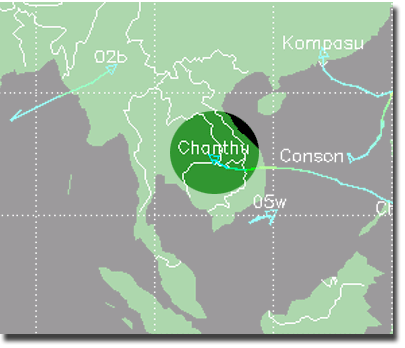หรือที่ละติจูด 15.5 องศาเหนือ ลองติจูด 104 องศาตะวันออก มีความเร็วลมสูงสุดใกล้ศูนย์กลางประมาณ