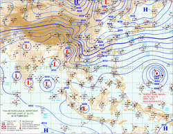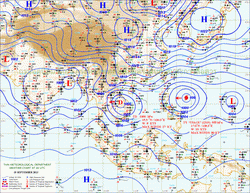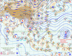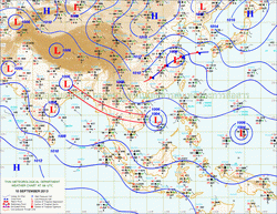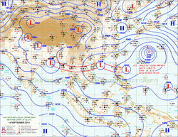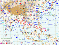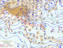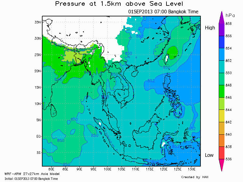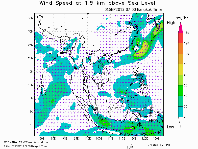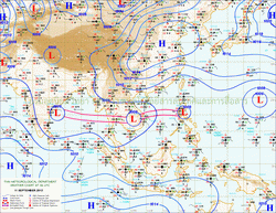 แผนที่ความกดอากาศและความเร็วลมที่ระดับความสูง 1.5 ก.ม. เหนือระดับน้ำทะเล ช่วงเดือนกันยายนถึงตุลาคม 2556