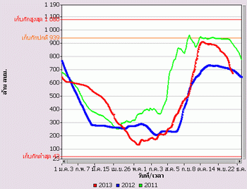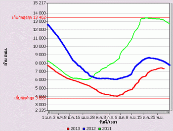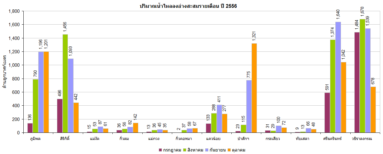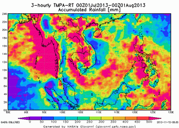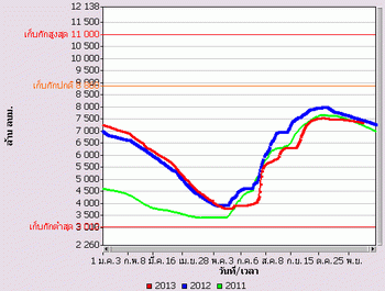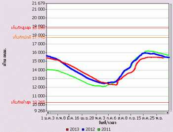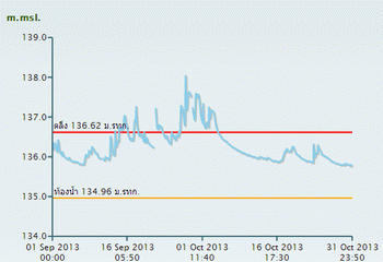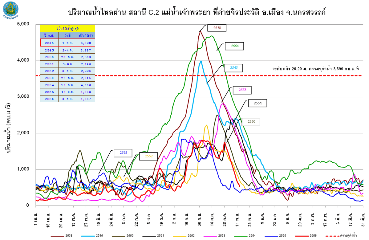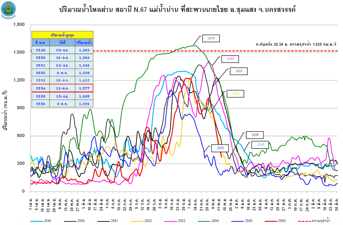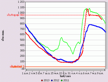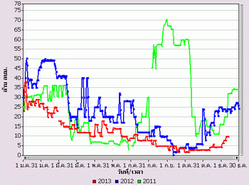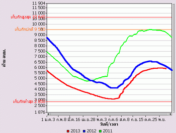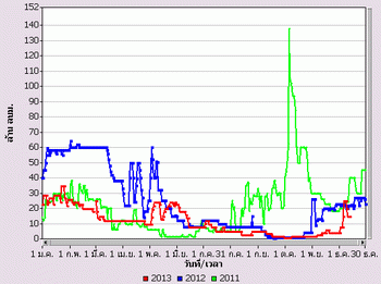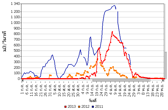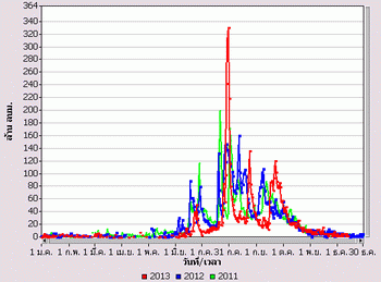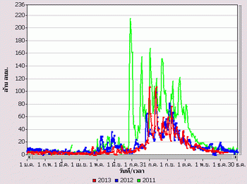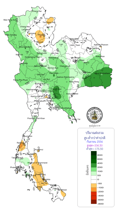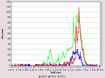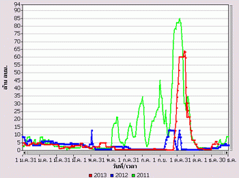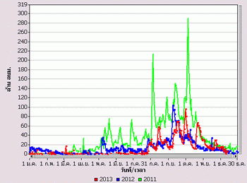 จากแผนภาพฝนสะสมรายเดือนเฉลี่ยและแผนภาพปริมาณฝนรวมสูง-ต่ำกว่าค่าปกติ ของกรมอุตุนิยมวิทยา เปรียบเทียบช่วงเดือนกรกฎาคมถึงตุลาคม 2556 หากพิจารณาเฉพาะภาคเหนือและภาคกลาง จะเห็นได้ว่า