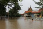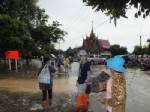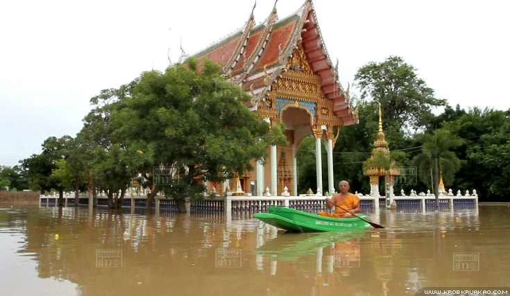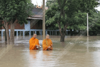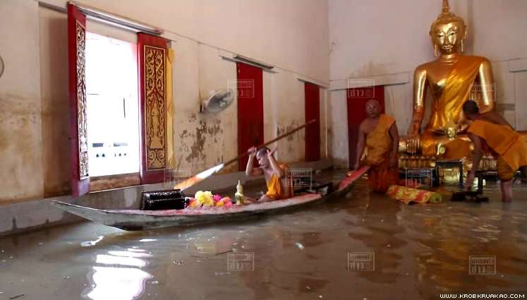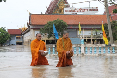 พระนครศรีอยุธยา - น้ำท่วมขยายวงกว้าง พระเณรต้องลุยน้ำบิณฑบาต กรมศิลปากรบอกโบราณสถานยังเอาอยู่