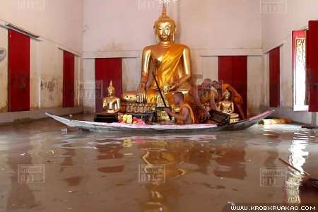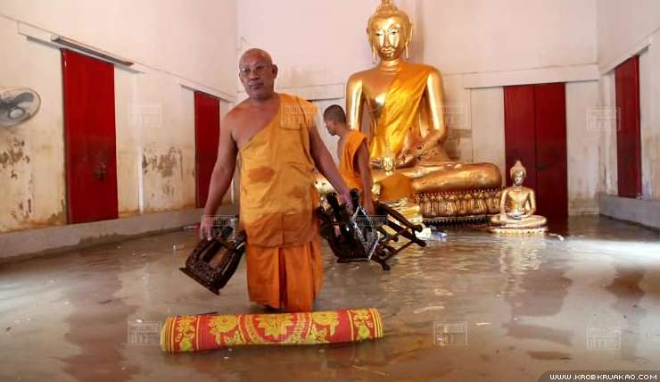 นอกจากนี้ ยังมีรายงานว่า ในเวลาเพียงคืนเดียว โบสถ์เก่าแก่ที่อยู่ระดับต่ำก็ถูกน้ำท่วมสูงถึง 1.50 เมตร ซ้ำระดับน้ำยังไหลทะลักเข้าท่วมภายในโบสถ์สูงกว่า 80 เซนติเมตร ดังนั้น พระสงฆ์และพระลูกวัดจึงต้องช่วยกันเคลื่อนย้ายโต๊ะหมู่บูชา รวมถึงเครื่องใช้ในกิจกรรมของสงฆ์ ไปเก็บไว้ในที่ปลอดภัยก่อนได้รับความเสียหาย โดยใช้เรือเครื่องหรือเรือพายเป็นพาหนะ ซึ่งภายในวัดดังกล่าว มีพระสงฆ์จำพรรษาอยู่เพียง 7 รูป ส่วนใหญ่เป็นพระชรา จึงไม่สามารถช่วยเหลือดูแลวัดได้มากนัก