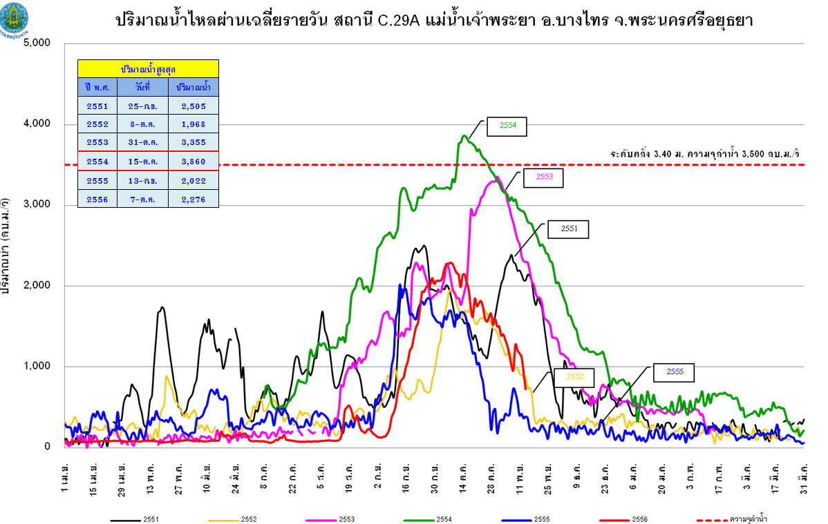 “เที่ยงนี้ริมคลองบางหลวง บางบาล แม่น้ำน้อย และแม่น้ำเจ้าพระยา ในเขตบางบาล พระนครศรีอยุธยา เสนา ผักไห่ บางไทร บางปะอิน จะเพิ่มต่อเนื่องเกือบทุกวัน เพราะน้ำจากนครสวรรค์ค่อนข้างเยอะพอสมควร แต่หากชลประทานควบคุมการระบายน้ำให้อยู่ไม่เกิน 2,000 ลูกบาศก์เมตรต่อวินาที ก็จะทำให้ระดับน้ำในจังหวัดฯ เพิ่มขึ้นไม่มากคือ ประมาณวันละ 15-20 เซนติเมตร อย่างไรก็ตาม คาดว่าจากนี้ไปอีก 4-5 วันน้ำจะเพิ่มขึ้นอีก 50 เซนติเมตร”