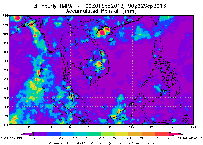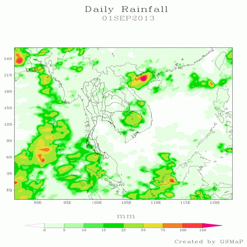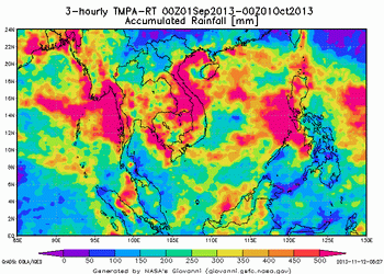 จากภาพถ่ายดาวเทียม MT-SAT แสดงการเคลื่อนตัวของกลุ่มเมฆ ของมหาวิทยาโคชิ พบว่าในช่วงเดือนกันยายนถึงตุลาคม 2556 มีกลุ่มเมฆปกคลุมพื้นที่ประเทศไทยค่อนข้างหนาอย่างต่อเนื่อง ทั้งหมด 4 ช่วง คือ