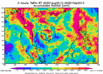1. ช่วงต้นเดือนกันยายน ประมาณวันที่ 5-8 ก.ย. 56 ร่องมรสุมกำลังแรงเลื่อนลงมาพาดผ่านบริเวณประเทศไทยตอนบน และได้พาดเข้าสู่หย่อมความกดอากาศต่ำกำลังแรงในทะเลจีนใต้ตอนกลาง ประกอบกับมรสุมตะวันตกเฉียงใต้พัดปกคลุมทะเลอันดามัน ประเทศไทยและอ่าวไทยอย่างต่อเนื่อง นอกจากนี้คลื่นกระแสลมตะวันออกได้เคลื่อนเข้ามาปกคลุมประเทศไทยตอนบนในช่วงวันที่ 7-8 ก.ย. 56 ให้บริเวณประเทศไทยตอนบนมีฝนตกหนักบางพื้นที่ จากนั้นมีปริมาณและการกระจายของฝนเพิ่มขึ้นครอบคลุมถึงภาคกลาง ปริมาณฝนมากที่สุดบริเวณประเทศไทยตอนบน 150.6 มิลลิเมตร ที่นิคมสร้างตนเองกระเสียว จังหวัดสุพรรณบุรี เมื่อวันที่ 8 ก.ย. 56 และมีรายงานน้ำป่าไหลหลากบริเวณจังหวัดน่าน เชียงรายและพะเยาเมื่อวันที่ 5,6 และ 8 ก.ย. 56