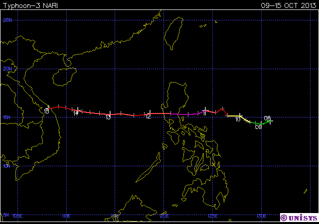 2.พายุไต้ฝุ่น "นารี" (Typhoon-3 NARI) ก่อตัวเป็นพายุเมื่อวันที่ 9 ต.ค. 56 และสลายตัวประมาณวันที่ 15 ต.ค. 56