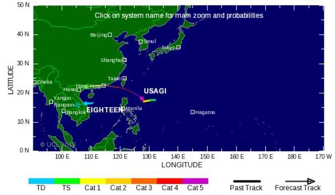 3.พายุไต้ฝุ่น "อุซางิ" (Super Typhoon-5 USAGI) ก่อตัวเป็นพายุเมื่อวันที่ 16 ก.ย. 56 และสลายตัวประมาณวันที่ 22 ก.ย. 56