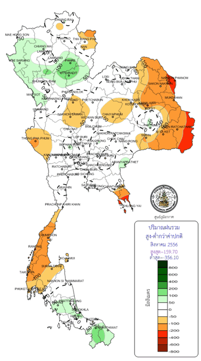 เดือนสิงหาคม ภาคเหนือมีปริมาณฝนสะสมรายเดือนเฉลี่ย 248 มิลลิเมตร สูงกว่าค่าปกติ 11% ภาคกลางมีปริมาณฝนสะสมรายเดือนเฉลี่ย 149 มิลลิเมตร ต่ำกว่าค่าปกติ 18%