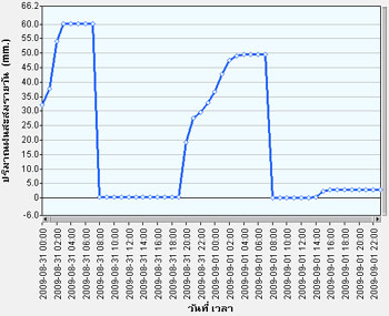 | จากกราฟแสดงข้อมูลปริมาณฝนสะสมที่ตรวจวัดได้จากสถานีโทรมาตรขนาดเล็กในพื้นที่จังหวัดแม่ฮ่องสอน พบว่าที่สถานีขุึนยวม ตรวจวัดปริมาณฝนสะสมสูงสุดได้ 88 มิลลิเมตร ในวันที่ 31 ส.ค. และ ที่สถานีตลาดแม่สะเรียงตรวจวัดปริมาณฝนสะสมสูงสุดได้ 60.20 มิลลิเมตร |