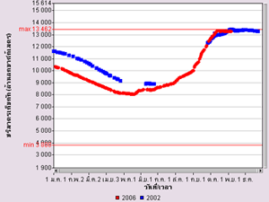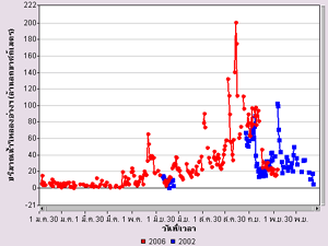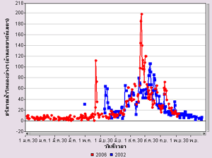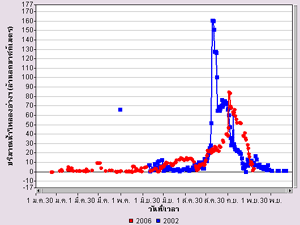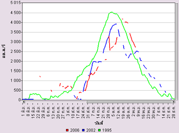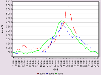 จากกราฟแสดงอัตราการไหลของน้ำที่เขื่อนเจ้าพระยา จ.ชัยนาท พบว่า มีอัตราการไหลสูงสุดที่ 4,188 ลบม./วิ ในวันที่ 19 ตุลาคม เมื่อเปรียบเทียบกับปี 2545 และปี 2538 ซึ่งเป็นปีที่เกิดน้ำท่วมหนัก จะเห็นได้ว่า ในปี 2545 มีอัตราการไหลผ่านสูงสุดอยู่ที่ 3,930 ลบม./วิ ในวันที่ 11 ตุลาคม ส่วนปี 2538 มีอัตราการไหลสูงสุดอยู่ที่ 4,557 ลบ.ม/วิ ในวันที่ 5 ตุลาคม |