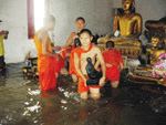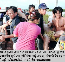 ด้าน อ.วัดโบสถ์ จ.พิษณุโลก น้ำจากแม่น้ำแควน้อยที่มีปริมาณสูงขึ้น เนื่องจากไม่สามารถระบายน้ำลงสู่ แม่น้ำน่านได้เพราะมีการปิดประตูระบายน้ำฝายมะขามสูง ต.มะขามสูง อ.เมืองพิษณุโลก เพื่อป้องกันไม่ให้น้ำท่วมในเขตเศรษฐกิจใน อ.เมืองพิษณุโลก ทำให้ระดับน้ำในแม่น้ำน่านลดลง แต่แม่น้ำแควน้อยกลับหนุนสูงท่วมพื้นที่บ้านเรือนประชาชนและร้านค้าต่างๆ ในเขตเทศบาลตำบลวัดโบสถ์ สูงกว่า 30 ซม. และขยายวงกว้างเข้าพื้นที่ ต.ท้อแท้ และ ต.หินลาด ราษฎรได้รับความเดือดร้อนไม่ต่ำกว่า 500 ครัวเรือน นอกจากนี้น้ำยังเข้าท่วมบริเวณพื้นที่ สภ.อ.วัดโบสถ์ ระดับน้ำประมาณ 50 ซม. ทำเอาครอบครัวข้าราชการตำรวจต้องเร่งอพยพสิ่งของต่างๆ ไปอยู่ยังที่สูง ส่วน อ.พรหมพิราม ก็ได้รับผลกระทบถูกแม่น้ำยมที่ไหลมาจาก อ.กงไกรลาศ จ.สุโขทัย ไหลท่วมเป็นรอบที่ 4 ปริมาณน้ำไหลผ่าน แม่น้ำเจ้าพระยาที่ จ.นครสวรรค์ เมื่อวันที่ 15 ต.ค. สูงขึ้นเป็น 5,740 ลบ.ม.ต่อวินาที และจะไหลเข้าสู่ กทม.อีก 2-3 วัน ซึ่งจะตรงกับช่วงน้ำทะเลหนุนสูงสุดในวันที่ 23 ต.ค.ด้วย กรมชลประทานจำเป็นต้องเร่งผันน้ำจากเขื่อนเจ้าพระยาเข้าพื้นที่นาของเกษตรกร 18 แห่ง รวม 6 จังหวัด ตั้งแต่ จ.ชัยนาทถึงปทุมธานี รวมทั้งหมด 1,300,000 ไร่ โดยจะเริ่มตั้งแต่วันที่ 16 ต.ค. และจะให้ส่งผลกระทบต่อพืชผลของเกษตรกรน้อยที่สุด การผันน้ำดังกล่าวจะช่วยลดระดับน้ำในแม่น้ำเจ้าพระยาลงได้ประมาณ 518 ล้าน ลบ.ม. จะบรรเทาปัญหาน้ำท่วมได้ในระดับหนึ่ง |