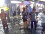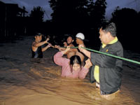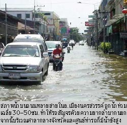 ข่าวจากหนังสือพิมพ์ ฝนถล่ม กทม.ชั้นในวิกฤต วันนี้น้ำทะเลหนุนสูงสุด! เรือแสนแสบหยุด2-3วัน [ มติชน : 28 ก.ย. 49 ]![]() วันที่ 27 กันยายน ฝนที่ตกลงมาวัดปริมาณน้ำฝนได้เฉลี่ยประมาณ 80 มิลลิเมตรต่อชั่วโมง โดยตกหนักที่สุดในเขตบางซื่อ วัดได้ 110.5 มิลลิเมตรต่อชั่วโมง ขณะที่ระบบระบายน้ำท่วมของ กทม. สามารถรองรับได้เพียง 60 มิลลิเมตรต่อชั่วโมง เท่านั้น ช่วงที่ฝนตกหนัก สถานีสูบน้ำสามเสนเกิดปัญหาไฟฟ้าดับนาน 1-2 ชั่วโมง ส่งผลให้ไม่สามารถระบายน้ำฝนได้ จึงทำให้เกิดน้ำท่วมขังถึงขั้นวิกฤตในพื้นที่ชั้นใน ได้แก่ จตุจักร พญาไท บางซื่อ วังทองหลาง ตลิ่งชัน คลองสามวา และหนองจอก ถนนหลายสายมีน้ำท่วมสูง เช่น ถนนเทศบาลสงเคราะห์ ย่านวัดเสมียนนารี ถนนกำแพงเพชร ถนนลาดพร้าว ถนนรัชดาภิเษก ถนนพหลโยธิน แยกเกษตรฯ ถนนแจ้งวัฒนะ ถนนศรีนครินทร์ ถนนพัฒนาการ แยกเกียกกาย ส่วนคลองแสนแสบ หยุดให้บริการเดินเรือตั้งแต่วันที่ 27 กันยายนเป็นต้นไป เนื่องจากฝนที่ตกทำให้ระดับน้ำในคลองสูง 40 เซนติเมตร จากระดับน้ำทะเลปานกลาง (รทก.) ส่งผลให้เรือไม่สามารถลอดใต้สะพานข้ามคลองบริเวณวัดพระยายัง และคลองตันได้ พื้นที่น่าห่วงมากที่สุด คือ บริเวณด้านตะวันออกติดกับสนามบินสุวรรณภูมิ โดยเฉพาะเขตลาดกระบัง เพราะเป็นพื้นที่รับน้ำของ กทม.ที่มีลักษณะเป็นแอ่งกระทะ เมื่อมีน้ำหลากจะท่วมขังติดต่อกันหลายวัน ยิ่งช่วงนี้มีการเปิดใช้สนามบินสุวรรณภูมิ ทำให้ กทม.เสียพื้นที่รับน้ำประมาณ 32 ตารางกิโลเมตร เนื่องจากพื้นที่นี้เป็นพื้นที่ปิดล้อมจึงต้องป้องกันด้วยกระสอบทรายกั้นน้ำไหลเข้าหมู่บ้าน นอกจากนี้ยังติดเครื่องสูบน้ำเคลื่อนที่กระจายตามชุมชน หมู่บ้านต่างๆ ด้วย ขณะเดียวกัน กรมชลประทานมีกำลังระบายน้ำออกอ่าวไทยประมาณ 300 ลูกบาศก์เมตรต่อวินาที ที่ จ.ตาก ชาวบ้าน ต.แม่สลิด อ.บ้านตาก ได้รับความเดือดร้อนจากน้ำท่วม เนื่องจากแม่น้ำวังเอ่อล้นตลิ่งเข้าท่วมพื้นที่บางจุดสูงถึง 2.15 เมตร เจ้าหน้าที่ฝ่ายต่างๆ รวมทั้งตำรวจ สภ.ต.แม่สลิด ต้องนำเรือท้องแบน 3 ลำ เข้าไปให้ความช่วยเหลือชาวบ้าน อำเภอที่ได้รับผลกระทบจากน้ำท่วม ได้แก่ เมือง สามง่าม โพธิ์ประทับช้าง วชิรบารมี บางมูลนาก ตะพานหิน ทับคล้อ และวังทรายพูน โดย อ.โพทะเล ได้รับกระทบหนักที่สุด เพราะเป็นจุดสุด ท้ายที่น้ำมาไหลกองรวมกัน โดยชาวบ้านได้รับความเดือดร้อน 97 หมู่บ้าน ถนนเสียหาย 10 สาย ถนนลูกรัง 80 สาย วัด 10 แห่ง โรงเรียน 8 โรง สิ่งที่เป็นห่วงขณะนี้คือ ชาวบ้านหมู่ 5 และหมู่ 9 ต.ท่าขมิ้น อ.โพทะเล มีสภาพเหมือนติดเกาะ ที่ จ.สุโขทัย สถานการณ์น้ำท่วมยังไม่