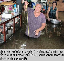การระบายนํ้าจากแม่น้ำเจ้าพระยาเข้าทุ่งมะขามหย่องและทุ่งภูเขาทอง ทำให้น้ำใน อ.มหาราช บางปะหัน ท่าเรือ บ้านแพรก และบางบาลบางส่วนลดลง แต่จะผันน้ำได้เฉพาะทุ่งภูเขาทองกับทุ่งมะขามหย่องเท่านั้น ส่วนจุดอื่นชาวอยุธยาคงไม่ยินยอม เพราะขณะนี้นาข้าวอยู่ระหว่างตั้งท้อง หากปล่อยน้ำเข้าจะทำให้ข้าวล่มตายหมด ที่ จ.สุพรรณบุรี แม่น้ำท่าจีนเอ่อล้นท่วมชุมชนหลายแห่งใน อ.เมืองสุพรรณบุรี โดยเฉพาะถนนสายสุพรรณบุรี-บางปลาม้า ต.ท่าระหัด ขาดเป็นช่วงๆ บ้านเรือนจมน้ำกว่า 600 หลัง ส่วนที่ อ.บางปลาม้า กระแสน้ำได้เซาะพนังกั้นน้ำริมแม่น้ำท่าจีนจนพังทลาย ทำให้น้ำไหลเข้าตลาดเก้าห้อง ต.บางปลาม้า ซึ่งเป็นตลาดอนุรักษ์อายุกว่า 100 ปี รวมทั้งยังไหลเข้าศาลเจ้าและหอดูโจรในอดีต โดยระดับน้ำมีปริมาณสูงประมาณ 1.50 เมตร