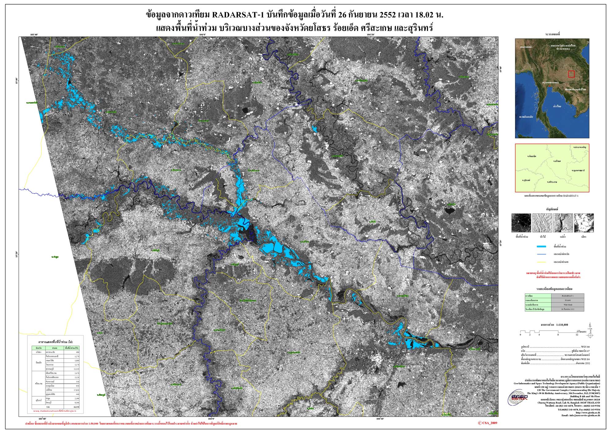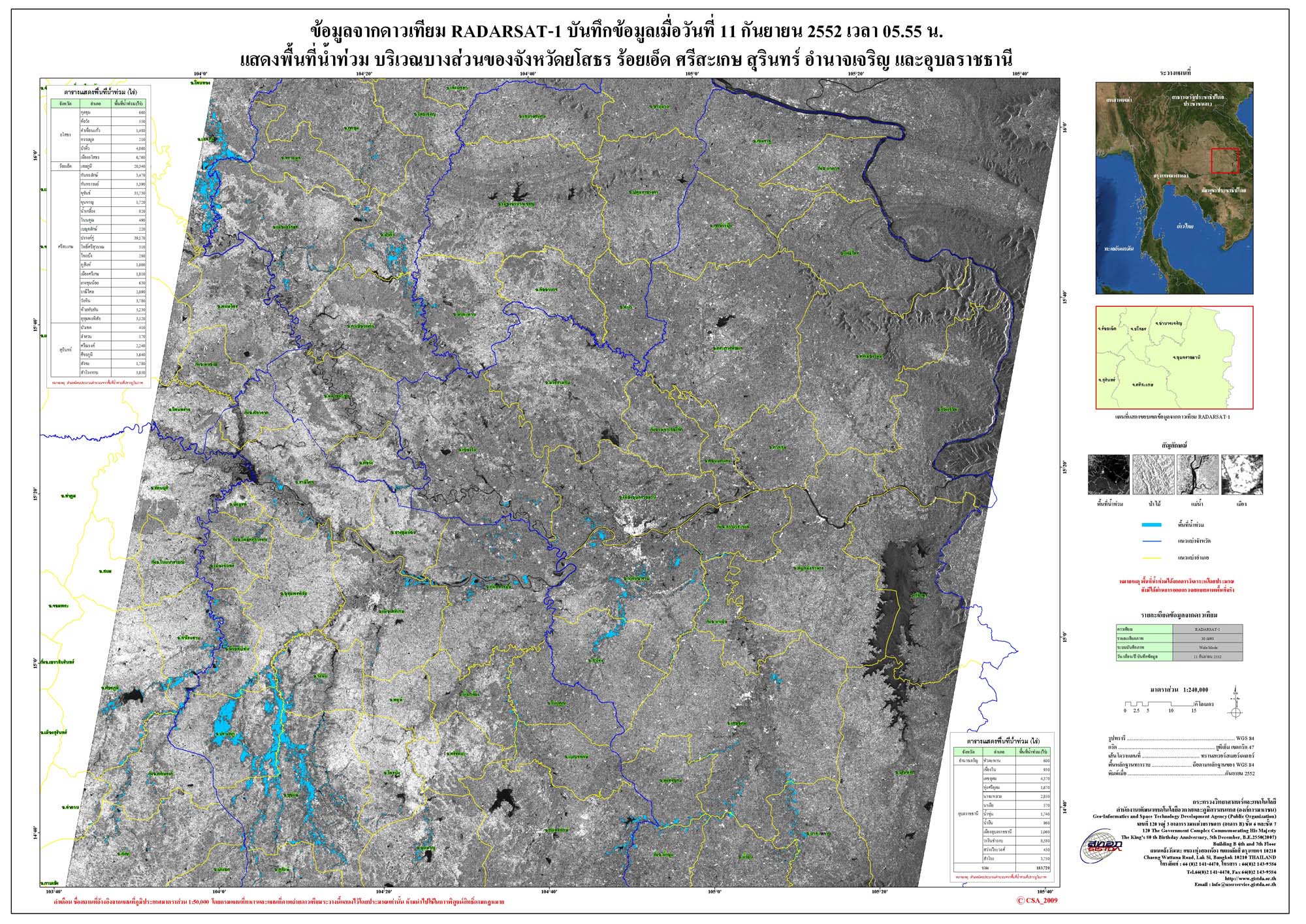 | จากภาพถ่ายดาวเทียม GOES-9 พบว่าในเดือนกันยายนมีกลุ่มเมฆปกคลุมพื้นที่ประเทศไทยคอนข้างต่อเนื่องโดยเฉพาะบริเวณตอนบนของประเทศ จังหวัดอุบลราชธานีและศรีสะเกษเป็นพื้นที่หนึ่งที่ีมีกลุ่มเมฆปกคลุมค่อนข้างหนาและค่อนข้างต่อเนื่อง ทำให้บริเวณดังกล่าวมีฝนตกค่อนข้างมาก และส่งผลทำให้เกิดน้ำท่วมในหลายพื้นที่ ประกอบกับในช่วงปลายเดือน พายุ "กีสน่า" ได้เคลื่อนตัวเข้าใกล้ประเทศไทย ทางด้านภาคตะวันออกเฉียงเหนือ ทำให้พื้นที่ดังกล่าวที่มีน้ำท่วมอยู่แล้วเกิดน้ำท่วมเพิ่มเป็นบริเวณกว้างมากยิ่งขึ้น โดยทางจังวัดอุบลราชธานีได้ประกาศพื้นที่ประสบภัยบฉุกเฉินทั้งหมด 23 อำเภอ ประกอบด้วย อ.เมือง อ.วารินชำราบ อ.ตระการพืชผล อ.โพธิ์ไทร อ.ตาลสุม อ.เดชอุดม อ.กุดข้าวปุ้น อ.โขงเจียม อ.ม่วงสามสิบ อ.น้ำขุ่น อ.เขมราฐ อ.พิบูลมังสาหาร อ.ดอนมดแดง อ.นาเยีย อ.เหล่าเสือโก้ก อ.น้ำยืน อ.ทุ่งศรีอุดม อ.สำโรง อ.นาจะหลวย อ.นาตาล อ.ศรีเมืองใหม่ อ.สิรินธร และ อ.สว่างวีระวงษ์ ส่วนจังหวัดศรีสะเกษเกิดพื้นที่น้ำท่วมในอำเภออุทุมพรพิสัย ภูสิงห์ ไพรบึง ขุขันธ์ ปรางค์กู่ ห้วยทับทัน ราศีไศล ดูรายละเอียดเพิ่มเติม |