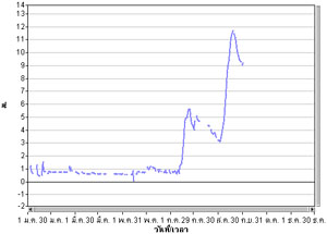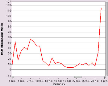 จากกราฟแสดงปริมาณไหลลงอ่างเก็บน้ำเขื่อนสิรินธร พบว่าช่วงต้นเดือนปริมาณน้ำไหลลงอ่างเก็บน้ำเขื่อนสิรินธรค่อนข้างมาก และได้ลดลงตามลำดับ และในช่วงสิ้นเดือนปริมาณน้ำไหลลงอ่างฯ เพิ่มสูงขึ้นถึง 114.63 ล้าน ลบ.ม. อันเป็นผลมาจากพายุดีเปรสชั่น "กีสน่า" |