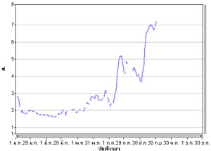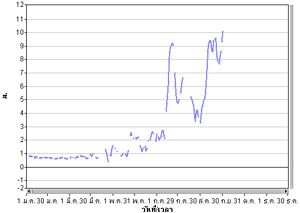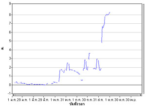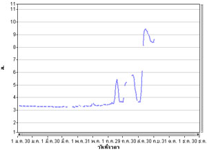 | จากกราฟแสดงข้อมูลระดับน้ำจากสถานีตรวจวัดน้ำท่ากรมชลประทาน พบว่ามีระดับน้ำล้นตลิ่งอยู่หลายจุด้วยกัน โดยเฉพาะที่สถานีห้วยทับทัน และสถานีบ้านหนองหญ้าปล้อง จังหวัดศรีสะเกษ ที่มีระดับน้ำล้นตลิ่งค่อนข้างสูง โดยที่สถานีห้วยทับทันระดับน้ำน้ำสูงสุดอยู่ที่ 9.42 เมตร ในวันที่ 13 ก.ย. ในขณะที่ระดับตลิ่งสูงเพียงแค่ 6.0 เมตร ส่วนสถานีหนองหญ้าปล้องระดับน้ำสูงสุดอยู่ที่ 11.67 เมตร ในวันที่ 18 ก.ย. ในขณะที่ระดับตลิ่งอยู่ที่ 7.78 เมตร | ||