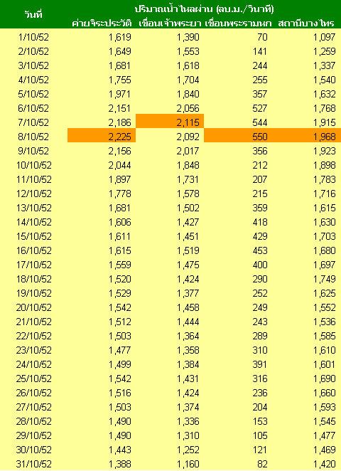 ซึ่งเมื่อเทียบกับช่วงเดียวกัน เมื่อปี 2549 พบว่า ปริมาณน้ำที่ไหลผ่านจังหวัดนครสวรรค์ น้อยกว่าเมื่อปี 2549 (น้ำท่วมหนัก) ถึง 1,709 ลูกบาศก์เมตรต่อวินาที และมีน้ำไหลผ่านเขื่อนเจ้าพระยาน้อยกว่าปี 2549 จำนวน 708 ลูกบาศก์เมตรต่อวินาที และเมื่อดูปริมาณน้ำจากเขื่อนพระราม 6 ที่จะไหลเข้ามาสมทบในแม่นำเจ้าพระยา ก็มีเพียง 544 ลูกบาศก์เมตรต่อวินาที และที่สำคัญ แนวโน้มปริมาณน้ำเริ่มทรงตัว และลดลง ทำให้กรมชลประทาน มั่นใจหากไม่มีพายุ หรือฝนตกหนักขึ้นอีก น้ำเหนือที่ไหลหลากในแม่น้ำเจ้าพระยาปีนี้จะไม่กระทบต่อกรุงเทพมหานคร และปริมณฑล ซึ่งจากระดับน้ำดังกล่าวจะทำให้มีน้ำไหลผ่านกรุงเทพที่ระดับ 1,915 ลูกบาศก์เมตรต่อวินาที ขณะที่แม่น้ำเจ้าพระยาสามารถรองรับน้ำได้ถึง 3,500 ลูกบาศก์เมตรต่อวินาที ถึงจะส่งผลกระทบต่อกรุงเทพและปริมณฑล