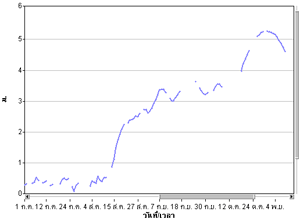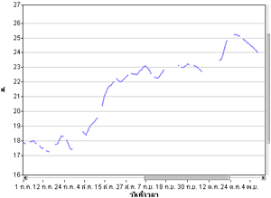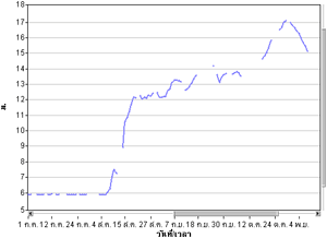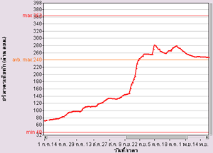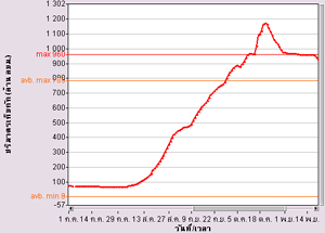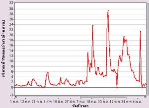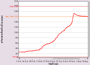 | จากกราฟแสดงข้อมูลระดับน้ำจากสถานีตรวจวัดน้ำท่ากรมชลประทานในแม่น้ำเจ้าพระยา พบว่าที่ค่ายจิรประวัติ จ.นครสวรรค์ มีระดับน้ำค่อนข้างสูง ส่วนที่เขื่อนเจ้าพระยา จ.ชัยนาท และที่สะพานรถยนต์ จ.พระนครศรีอุธยา มีระดับน้ำล้นตลิ่ง รายละเอียดเพิ่มเติม |