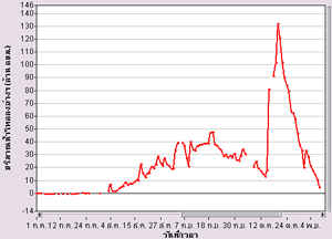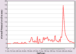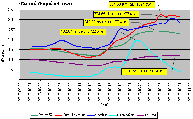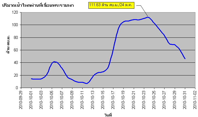 | จากกราฟแสดงปริมาณน้ำไหลผ่านรายวันที่สถานีวัดน้ำท่าในแม่น้ำเจ้าพระยา ช่วงเดือนตุลาคม 2553 พบว่าปริมาณน้ำเริ่มเพิ่มสูงขึ้นค่อนข้างมากตั้งแต่ช่วงกลางเดือน โดยปริมาณน้ำไหลผ่านสูงสุดที่สถานีค่ายจิรประวัติ อ.เมือง จ.นครสวรรค์ อยู่ที่ 243.22 ล้านลูกบาศก์เมตร (2,815 ลูกบาศก์เมตรต่อวินาที) ในวันที่ 26 ตุลาคม ที่สถานีท้ายเขื่อนเจ้าพระยา อ.สรรพยา จ.ชัยนาท มีปริมาณน้ำไหลผ่านสูงสุด อยู่ที่ 324.60 ล้านลูกบาศก์เมตร ( 3,757 ลูกบาศก์เมตรต่อวินาที) ในวันที่ 27 ตุลาคม ส่วนที่สถานีบางไทร อ.บางไทร จ.พระนครศรีอยุธยา มีปริมาณน้ำไหลผ่านสุงสุดอยู่ที่ 304.65 ล้านลูกบาศก์เมตร ( 3,526 ลูกบาศก์เมตรต่อวินาที) ในวันที่ 29 ตุลาคม |