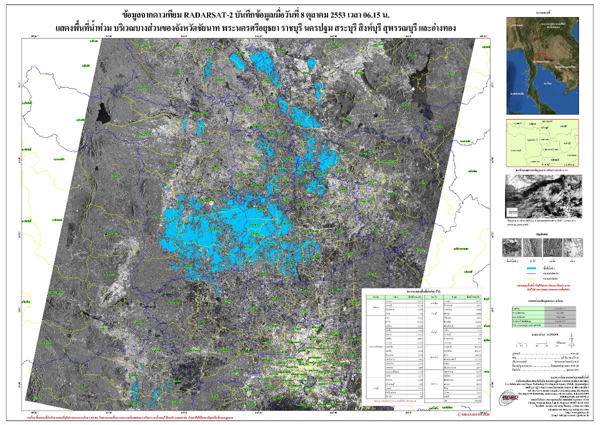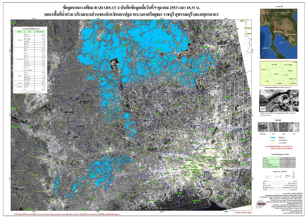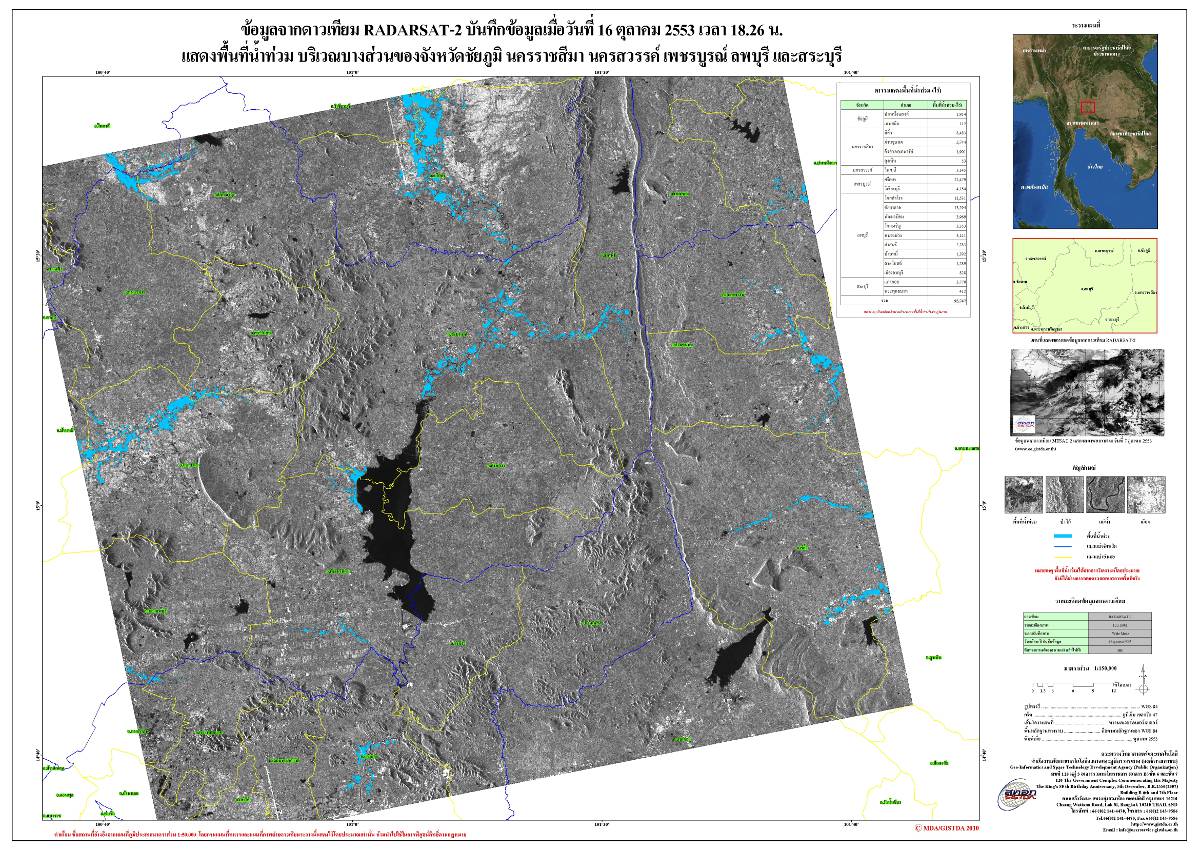 รายงานการติดตามพื้นที่น้ำท่วม ปี 2553 โดยใ้่ช้ข้อมูลจากดาวเทียม RADARSAT-2 จัดทำโดย สำนักงานพัฒนาเทคโนโลยีอวกาศและภูมิสารสนเทศ (GISTDA)