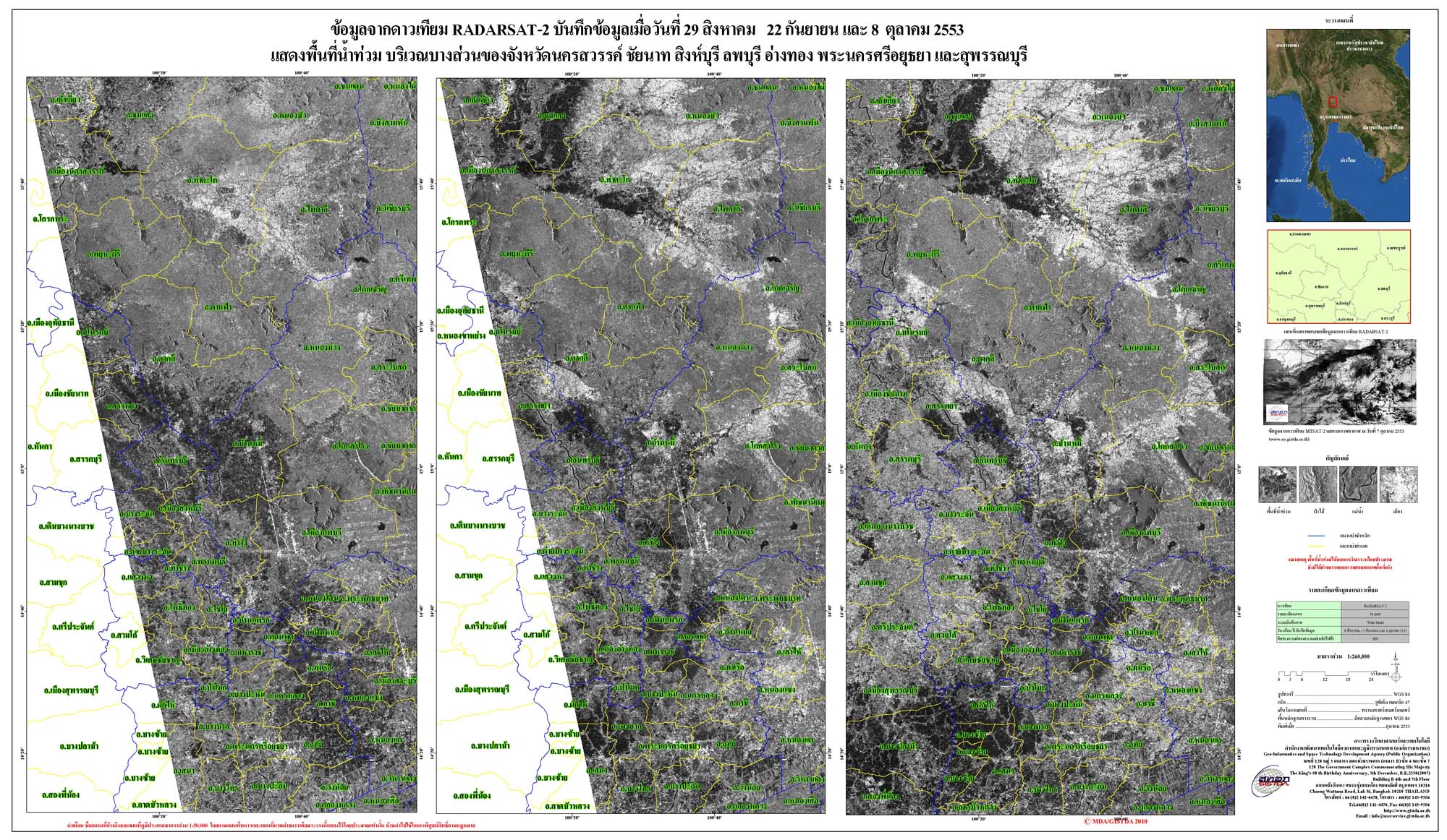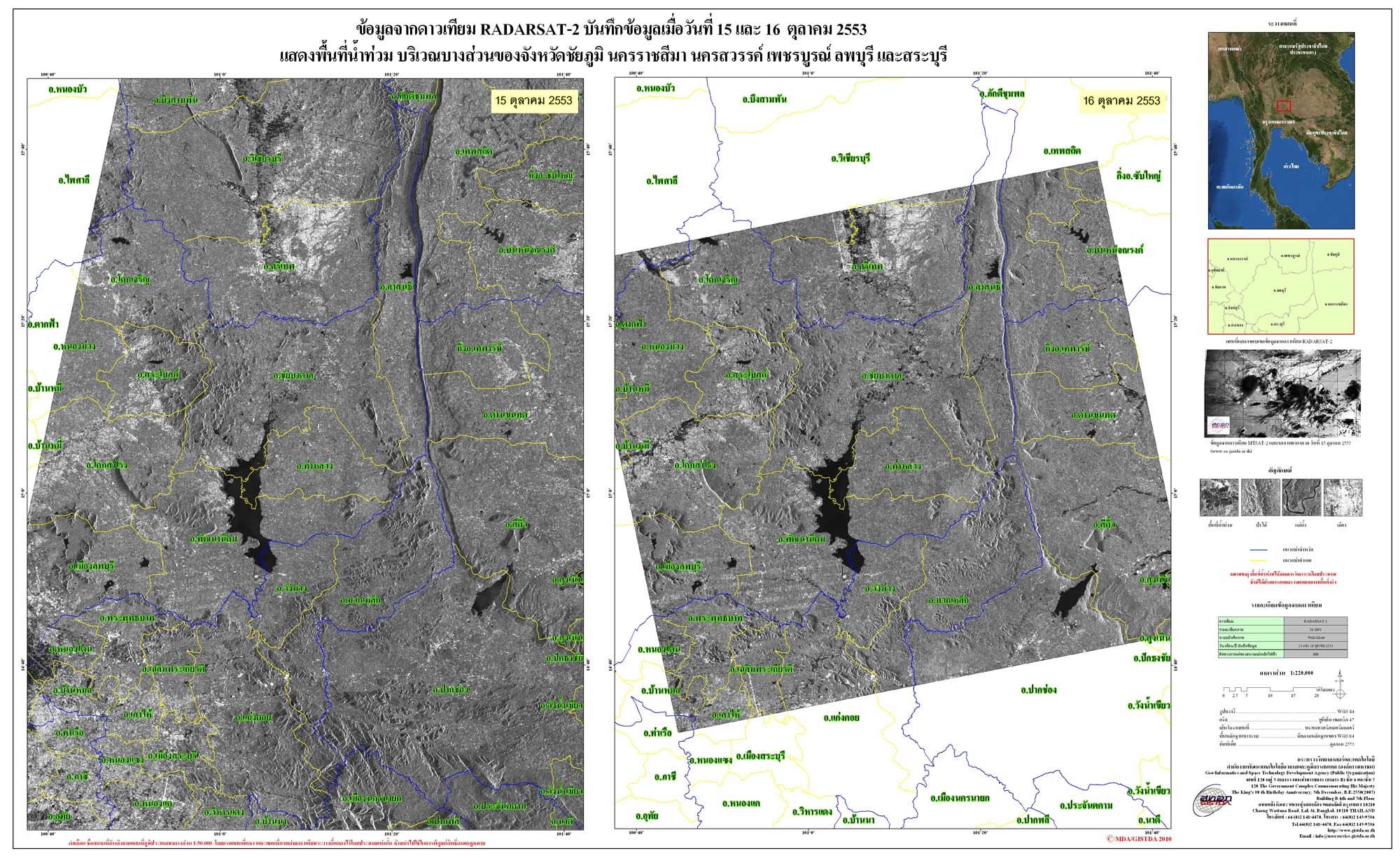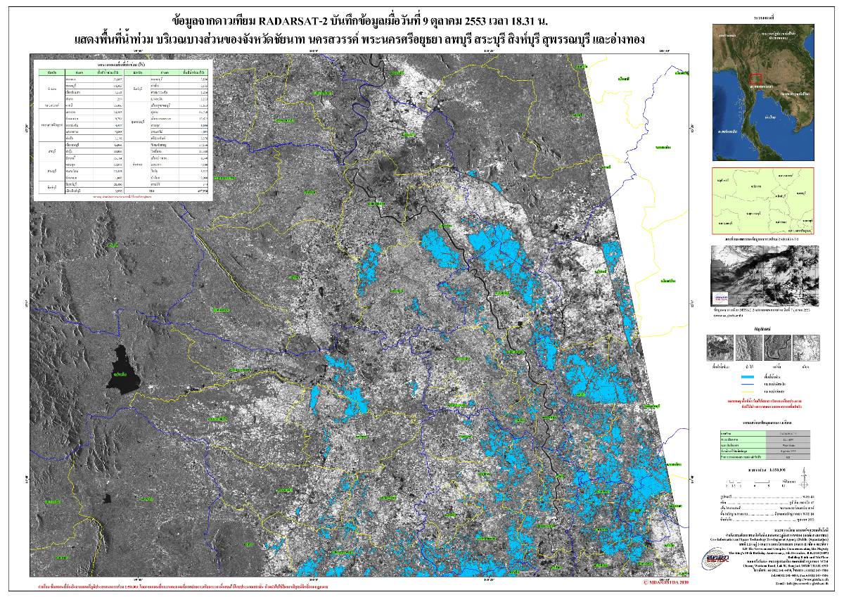 รายงานการติดตามพื้นที่น้ำท่วม ปี 2553 โดยใ้่ช้ข้อมูลจากดาวเทียม RADARSAT-2 จัดทำโดย สำนักงานพัฒนาเทคโนโลยีอวกาศและภูมิสารสนเทศ (GISTDA)