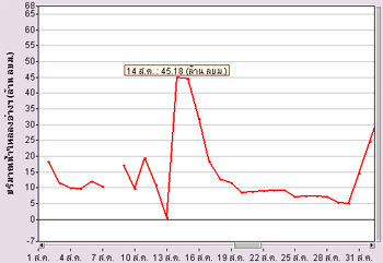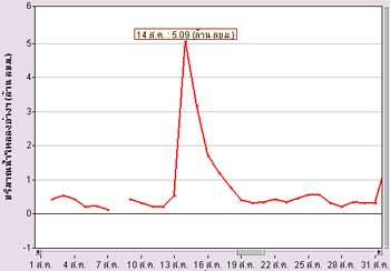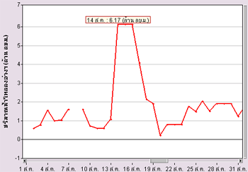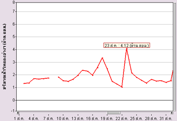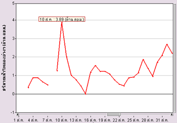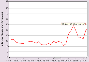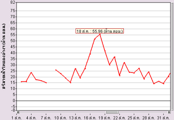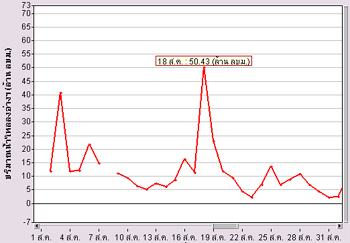 จากกราฟแสดงปริมาณไหลลงอ่างเก็บน้ำขนาดใหญ่ในพื้นที่ภาคเหนือและภาคตะวันออกเฉียงเหนือ จะพบว่าจากการที่มีฝนตกค่อนข้างมากทำให้ปริมาณน้ำไหลลงอ่างในแต่ละเขื่อนเพิ่มปริมาณสูงขึ้น โดยในวันที่ 10 ส.ค. ปริมาณน้ำไหลลงเืขื่อนแม่งัด อยู่ที่ 3.89 ล้าน ลบ.ม. ในวันที่ 14 ส.ค. ปริมาณน้ำไหลลงเขื่อนลำปาว น้ำพุง และน้ำอูน อยู่ที่ 45.18 , 5.09 และ 6.17 ล้าน ลบ.ม. ตามลำดับ ในวันที่ 18 ส.ค. ปริมาณน้ำไหลลงเขื่อนสิรินธร และเขื่อนสิริกิติ์ อยู่ที่ 50.43 และ 55.96 ล้าน ลบ.ม. และในวันที่ 27 ส.ค. ปริมาณน้ำไหลลงเขื่อนภูมิพล อยู่ที่ 48.33 ล้าน ลบ.ม. |