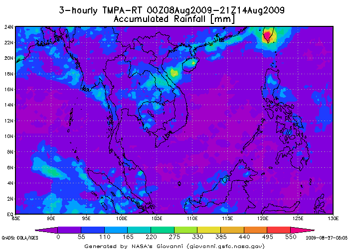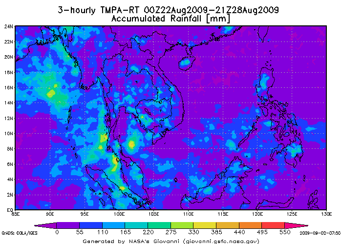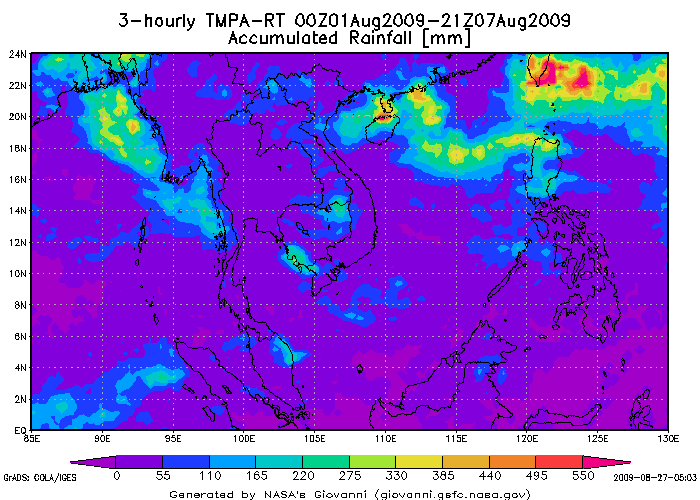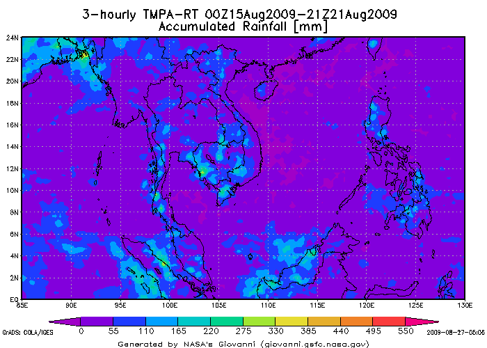 จากแผนภาพแสดงปริมาณฝนสะสมของสถาบันวิจัยทหารเรืออเมริกา พบว่ามีกลุ่มฝนกระจุกตัวกันอย่างต่อเนื่องในบริเวณภาคเหนือและภาคตะวันออกเฉียงเหนือ โดยเฉพาะช่วงวันที่ 13-14 ส.ค. และ 22-31 ส.ค. ที่กลุ่มฝนกระจุกตัวกันค่อนข้างหนาอย่างต่อเนื่อง รายละเอียดเพิ่มเติม |