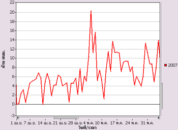 จากกราฟแสดงปริมาณน้ำไหลลงอ่างฯ เก็บน้ำขนาดใหญ่ในพื้นที่ภาคเหนือ และภาคกลาง พบว่า ปริมาณน้ำไหลลงอ่างฯ ในเดือนพ.ค. 50 เพิ่มขึ้นในทุกอ่าง โดยเฉพาะเขื่อนภูมิพล ที่มีปริมาณน้ำไหลลงอ่างฯ สูงสุดอยู่ที่ 78.51 ล้านลูกบาศก์เมตร ในวันที่ 15 พ.ค. 50 ตารางและกราฟแสดงข้อมูลน้ำรายวันในอ่างเก็บน้ำขนาดใหญ่ |
