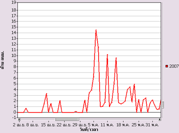 dBz หมายเหตุ : เวลาประเทศไทย = เวลา GMT + 7 ชั่วโมงข้อมูลจากเครือข่ายภาพเรดาร์กรมอุตุนิยมวิทยา เรดาร์เชียงใหม่ พบว่าตั้งแต่วันที่ 1-20 พ.ค. 50 มีฝนตกอย่างต่อเนื่องบริเวณภาคเหนือตอนบน โดยเฉพาะช่วงวันที่ 3-7 พ.ค. ที่เกิดพายุดีเปรสชั่นในทะเลอันดามัน และวันที่ 12-14 พ.ค. ที่ได้รับอิทธิพลจากพายุไซโคลนในอ่าวเบงกอล ดูรายละเอียดเพิ่มเติม |