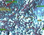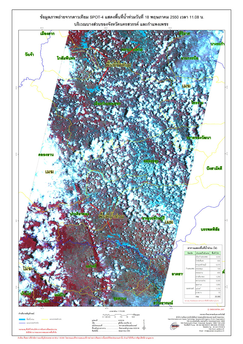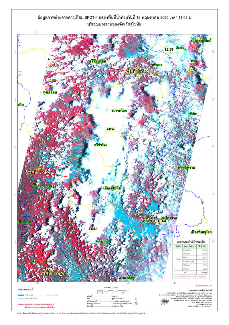 ข้อมูลจากภาพถ่ายดาวเทียม SPOT-4 แสดงพื้นที่น้ำท่วมวันที่ 18 พฤษภาคม 2550 เวลา 11.08 น. บริเวณบางส่วนของจังหวัด สุโขทัย |
