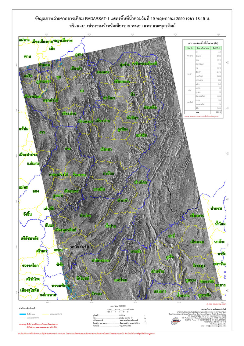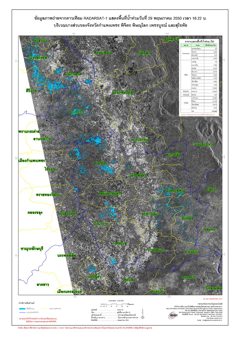 ข้อมูลจากภาพถ่ายดาวเทียม RADARSAT-1 แสดงพื้นที่น้ำท่วมวันที่ 29 พฤษภาคม 2550 เวลา 18.22 น. บริเวณบางส่วนของ จังหวัดกำแพงเพชร พิจิตร พิษณุโลก เพชรบูรณ์ และสุโขทัย |