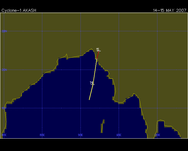 Date: 14-15 MAY 2007 Cyclone-1 AKASH ที่มา : UNISYS Weather (http://weather.unisys.com/hurricane/n_indian/2007/index.html) ช่วงวันที่ 1-4 พ.ค. 50 มีพายุดีเปรสชั่นบริเวณทะเลอันดามัน โดยวันที่ 2 พ.ค. 50 มีศูนย์กลางอยู่ห่างจากจังหวัดชุมพรไปทางตะวันตกประมาณ 350 กิโลเมตร หรือ ที่ละติจูด 11.5 องศาเหนือ ลองจิจูด 95.0 องศาตะวันออก มีความเร็วลมสูงสุดใกล้ศูนย์กลางประมาณ 55 กิโลเมตรต่อชั่วโมง และเคลื่อนตัวทางตะวันตกค่อนทางเหนือด้วยความเร็วประมาณ 10 กิโลเมตรต่อชั่วโมงต่อมาในวันที่ 3 พ.ค. 50 เวลา พายุดีเปรสชั่นในทะเลอันดามัน มีศูนย์กลางอยู่ห่างจากจังหวัดตากไปทางตะวันตกเฉียงใต้ ประมาณ 600 กิโลเมตร หรือที่ละติจูด 13.0 องศาเหนือ ลองจิจูด 94.5 องศาตะวันออก มีความเร็วลมสูงสุดใกล้ศูนย์กลางประมาณ 55 กิโลเมตรต่อชั่วโมง โดยเคลื่อนตัวทางเหนือค่อนทางตะวันตก ด้วยความเร็วประมาณ 10 กิโลเมตรต่อชั่วโมง และในวันที่ 4 พ.ค. 54 พายุได้อ่อนกำลังลงเป็นหย่อมความกดอากาศต่ำคงปกคลุมบริเวณ ประเทศพม่า ทำให้ภาคเหนือและภาคกลางด้านตะวันตกมีฝนตกชุกหนาแน่น กับมีฝนตกหนักบางพื้นที่บริเวณจังหวัดแม่ฮ่องสอน ตาก เชียงราย เชียงใหม่ ลำปาง ลำพูน แพร่ น่าน พะเยา พิษณุโลก อุตรดิตถ์ สุโขทัย กำแพงเพชร เพชรบูรณ์ นครสวรรค์ อุทัยธานี ชัยนาท และกาญจนบุรี วันที่ 14 พ.ค. 50 พายุไซโคลน “01B” ในอ่าวเบงกอลตอนบน มีศูนย์กลางอยู่ทางตะวันตกของกรุงย่างกุ้ง ประเทศพม่า ห่างประมาณ 550 กิโลเมตร หรือที่ละติจูด 16.5 องศาเหนือ ลองจิจูด 91.5 องศาตะวันออก มีความเร็วลมสูงสุดใกล้ศูนย์กลางประมาณ 65 กิโลเมตรต่อชั่วโมง เคลื่อนตัวทางเหนือ ด้วยความเร็วประมาณ 10 กิโลเมตรต่อชั่วโมง ส่งผลให้ร่องความกดอากาศต่ำที่พาดผ่านประเทศไทยตอนบน กับมรสุมตะวันตกเฉียงใต้ที่พัดปกคลุมทะเลอันดามันและอ่าวไทยมีกำลังแรงขึ้น ลักษณะเช่นนี้ทำให้ภาคเหนือมีฝนตกชุกหนาแน่นเพิ่มมากขึ้น กับมีฝนตกหนักในหลายพื้นที่ ของจังหวัดแม่ฮ่องสอน เชียงใหม่ ลำพูน ลำปาง น่าน แพร่ อุตรดิตถ์ ตาก สุโขทัย และ กำแพงเพชร |