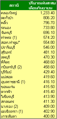 รายงานข้อมูลฝนสะสมในเดือนกันยายนจากสถานีตรวจอากาศของกรมอุตุนิยมวิทยา พบว่า ปริมาณฝนสะสมสูงสุดอยู่ที่สถานี คลองใหญ่ จังหวัดตราด รองลงมาคือสถานี ตะกั่วป่า จังหวัดพังงา และ สถานีพลิ้ว จังหวัด จันทบุรี และจากการตรวจสอบข้อมูลปริมาณฝนสะสม 24 ชม. พบว่า มีปริมาณฝนตกสูงสุดที่จังหวัดลพบุรี ในวันที่ 12 ก.ย. โดยมีปริมาณฝน 149 มิลลิเมตร รองลงมาคือที่สถานีปากช่อง จ.นครราชสีมา ปริมาณฝน 145.90 มิลลิเมตร ในวันที่ 12 ก.ย. เช่นเดียวกัน |