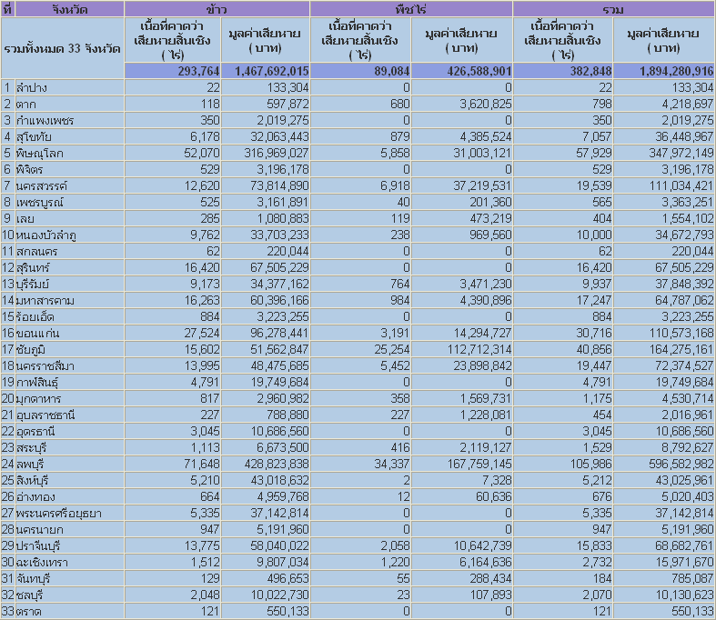 จากการติดตามสถานการณ์อุทกภัยอันเนื่องมาจากร่องความกดอากาศต่ำกำลังแรงพาดผ่านบริเวณภาคกลาง ภาคตะวันออก ภาคเหนือ และภาคตะวันออกเฉียงเหนือ ทำให้ประเทศไทยมีฝนตกชุกหนาแน่นและมีฝนตกหนัก ส่งผลให้เกิดจากน้ำท่วมฉับพลันและน้ำป่าไหลหลากหลายพื้นที่ โดยปัจจุบันในบางพื้นที่ยังคงมีสภาพน้ำท่วมขังอยู่เป็นเวลานานกว่า 15 วันได้แก่ จังหวัดพิษณุโลก ขอนแก่น มหาสารคาม กาฬสินธุ์ ลพบุรี พระนครศรีอยุธยา และปราจีนบุรี ทำให้เกิดความเสียหายเพิ่มขึ้นจากการประเมินในเบื้องต้นเมื่อเริ่มเกิดอุทกภัย ซึ่งสำนักงานเศรษฐกิจการเกษตร ได้วิเคราะห์ข้อมูลเพิ่มเติม จากการรายงานของกรมส่งเสริมการเกษตร สถานการณ์น้ำของกรมชลประทาน ปริมาณน้ำฝนและสภาพอากาศจากกรมอุตุนิยมวิทยา การติดตามสถานการณ์ในพื้นที่ของสำนักงานเศรษฐกิจการเกษตรเขต และข้อมูลดาวเทียม RADARSAT สรุปความเสียหายเฉพาะด้านพืช ดังนี้ 1. พื้นที่การเกษตรประสบภัยน้ำท่วม จำนวน 38 จังหวัด ได้แก่ จังหวัด เชียงใหม่ ลำปาง พะเยา แพร่ กำแพงเพชร ตาก แม่ฮ่องสอน สุโขทัย พิจิตร พิษณุโลก เพชรบูรณ์ นครสวรรค์ กาฬสินธุ์ ชัยภูมิ นครราชสีมา ขอนแก่น ร้อยเอ็ด หนองบัวลำภู มหาสารคาม มุกดาหาร บุรีรัมย์ เลย สุรินทร์ สกลนคร อุบลราชธานี อุดรธานี พระนครศรีอยุธยา ลพบุรี สระบุรี สิงห์บุรี อ่างทอง กรุงเทพฯ นครนายก ปราจีนบุรี ชลบุรี ฉะเชิงเทรา จันทบุรี และตราด 2. เนื้อที่การเกษตรเสียหาย (เฉพาะด้านพืช) 3.มูลค่าความเสียหายทางเศรษฐกิจจากผลผลิตการเกษตรเสียหาย ข้อมูลเนื้อที่เสียหาย และมูลค่าความเสียทางเศรษฐกิจ |
