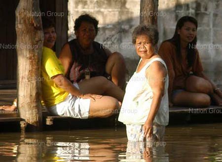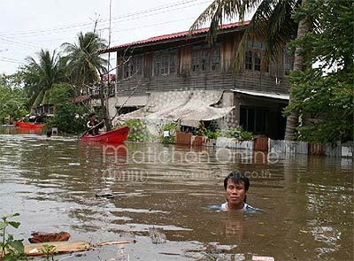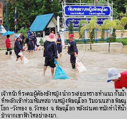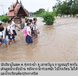 -------------------------------------------------------------------------------------- ![]() ![]() ![]() ![]() ภาพประกอบจาก หนังสือพิมพ์ไทยรัฐ และ หนังสือพิมพ์คมชัดลึก เมื่อวันที่ 15 กันยายน ที่ จ.กาญจนบุรี น้ำป่าไหลท่วม ต.ทุ่งกระบ่ำ และ ต.หนองโสน อ.เลาขวัญ โรงเรียนต้องประกาศหยุด พระออกบิณฑบาตไม่ได้ ไร่นาจมน้ำหลายพันไร่ ถนนสายเลาขวัญ - ทุ่งกระบ่ำ และสายเลาขวัญ - หนองโสนขาด ทั้งนี้ นายวินัย ถาวรนาน ผู้อำนวยการเขื่อนศรีนครินทร์ ต.ท่ากระดาน อ.ศรีสวัสดิ์ เปิดเผยว่า น้ำในอ่างเก็บน้ำมี 85% สามารถรองรับน้ำได้อีก 2,500 ล้านลูกบาศก์เมตร ขณะเดียวกัน ต้องชะลอการปล่อยน้ำ นายอำนาจ ผการัตน์ ผู้ว่าราชการจังหวัดกาญจนบุรี กล่าวว่า จะมีฝนตกหนักมากในหลายพื้นที่ ขอแจ้งเตือนประชาชนที่อยู่บริเวณที่ราบลุ่มริมน้ำและที่ลาดเชิงเขา รวมถึงพื้นที่เสี่ยงภัยระวังน้ำท่วมฉับพลัน น้ำป่าและดินถล่ม สำหรับเขื่อนต่างๆ ใน จ.กาญจนบุรี ยังรองรับน้ำได้อีกมาก และปลอดภัย 100% ที่ จ.พระนครศรีอยุธยา นายทศพล วังศิลาบัตร ประธานสภาอุตสาหกรรมจังหวัด เปิดเผยว่า การเดินเรือขนส่งสินค้า โดยเฉพาะปูนซีเมนต์ ข้าว และถ่านหิน มาตามแม่น้ำป่าสักในเขต อ.นครหลวง ได้รับผลกระทบอย่างหนัก เรือสินค้าต้องจอดหลบไม่กล้าเสี่ยง เพราะท้ายขบวนอาจกระแทกกับสะพานข้ามแม่น้ำ บางลำผ่านสะพานไม่ได้เพราะระดับน้ำสูง นอกจากนี้ การสร้างสะพานข้ามแม่น้ำป่าสัก บนถนนสายเอเชียในเขต ต.บ่อโพง อ.นครหลวง คงเสร็จไม่ทันตามกำหนด เพราะน้ำท่วมตอม่อ ที่ จ.สระบุรี นายสรรเสริญ เอี่ยมกมล รองผู้อำนวยการแขวงการทางสระบุรี ตรวจถนนสายแก่งคอย - นครนายก ช่วงกิโลเมตรที่ 9 พบว่า บริเวณสะพานบ้านโคกกรุง หมู่ 7 ต.ชำผักแพว อ.แก่งคอย พื้นสะพานแตก ดินใต้ถนนถูกน้ำกัดเซาะเป็นโพรงใหญ่ ผิวถนนคอนกรีตเหลือเพียง 10 เซนติเมตร ไม่สามารถรับน้ำหนักรถได้ต้องปิดห้ามผ่าน ที่ จ.นครนายก ชาวบ้านต้องขนย้ายข้าวของไปไว้ที่สูง ขณะเดียวกัน มีงูมากับกระแสน้ำเข้าไปกินไก่ในบ้าน ส.ต.อาทิตย์ ชไมพรเลิศสกุล อายุ 47 ปี อาจารย์วิทยาลัยเทคนิคนครนายก หน่วยกู้ภัยต้องเข้าไปจับออกมา เป็นงูเหลือมยาว 4.50 เมตร หนัก 25 กิโลกรัม ที่ จ.ปราจีนบุรี น้ำท่วมชุมชนตลาดเก่ากบินทร์บุรี เด็กๆ นำห่วงยางมาเล่นน้ำอย่างสนุกสนาน และน้ำจาก อ.กบินทร์บุรี เริ่มไหลลง อ.ศรีมหาโพธิ และ อ.เมืองปราจีนบุรี ขณะที่ระดับน้ำในแม่น้ำปราจีนบุรีสูงมาก คาดว่าภายใน 2 วันจะล้นตลิ่ง เกษตรกรเลี้ยงปลาทับทิมในกระชังต่างรีบจับปลาขายก่อนกำหนด เนื่องจากเกรงว่าโรงงานอุตสาหกรรมบางแห่งจะลักลอบปล่อยน้ำเสียลงสู่แม่น้ำ อย่างไรก็ตาม นางอนงค์วรรณ เทพสุทิน รัฐมนตรี