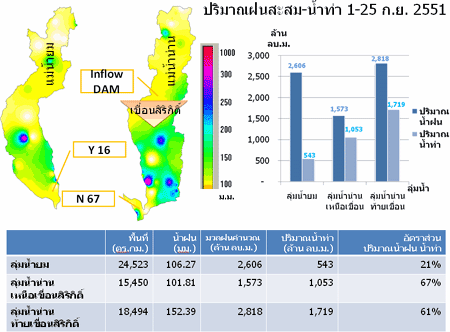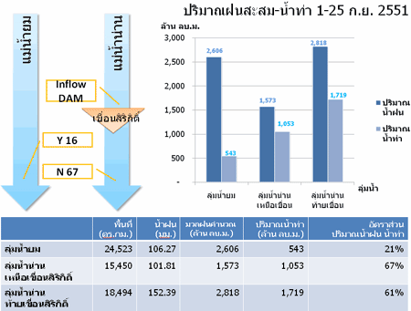 | ปริมาณฝนสะสม และ น้ำท่า บริเวณลุ่มน้ำยมและน่าน ระหว่างวันที่ 1-25 กันยายน 251 | ||