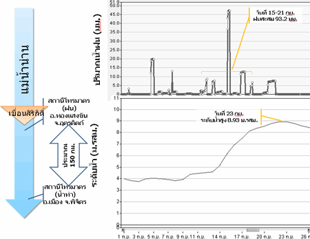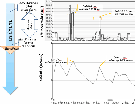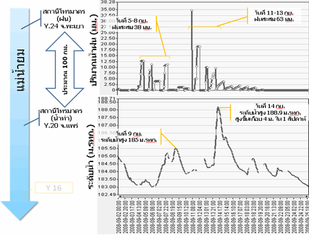 ปริมาณฝนสะสม 3 วัน ของลุ่มน้ำยม ในวันที่ 5-8 ก.ย. ส่งผลให้ระดับน้ำท่าในวันที่ 9 ก.ย. มีค่าเท่ากับ 185 เมตร รทก. และในวันที่ 11-13 ก.ย. ส่งผลให้ระดับน้ำท่าในวันที่ 14 ก.ย. มีค่าเท่ากับ 188.9 เมตร รทก. |