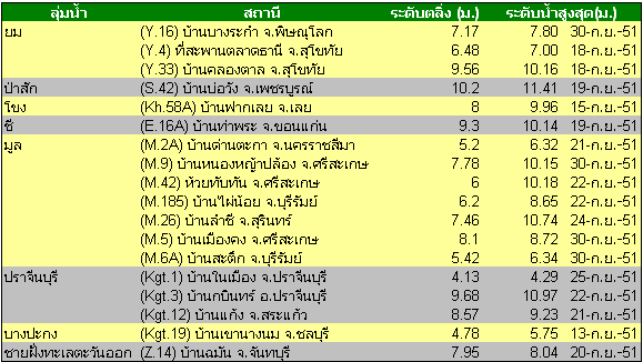 รายงานข้อมูลระดับน้ำรายวันจากสถานีตรวจวัดระดับน้ำของกรมชลประทานจะพบว่า มีระดับน้ำล้นตลิ่งในลุ่มน้ำ ยม ป่าสัก โขง มูล ชี ปราจีนบุรี บางปะกง และชายฝั่งทะเลตะวันออก ในพื้นที่จังหวัด พิษณุโลก สุโขทัย เพชรบูรณ์ เลย ขอนแก่น นครราชสีมา ศรีสะเกษ บุรีรัมย์ สุรินทร์ ปราจีนบุรี สระแก้ว ชลบุรี และ จันทบุรี |