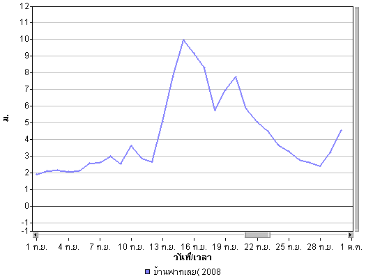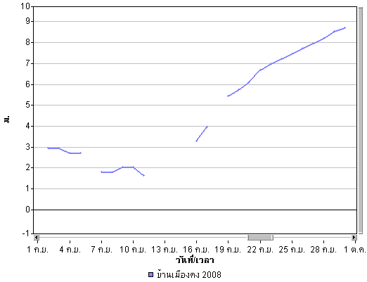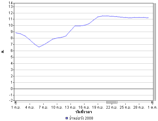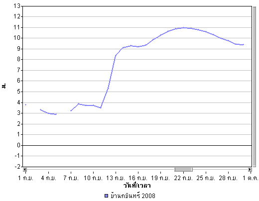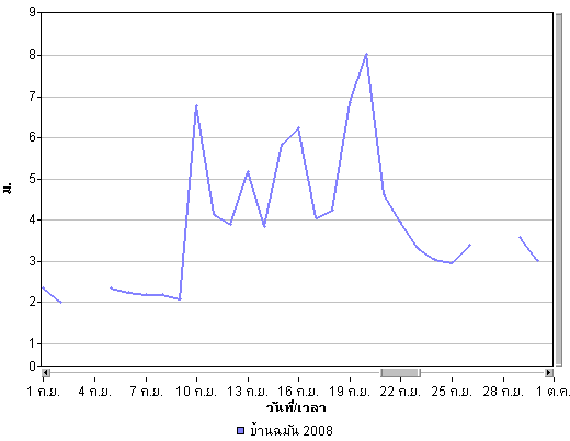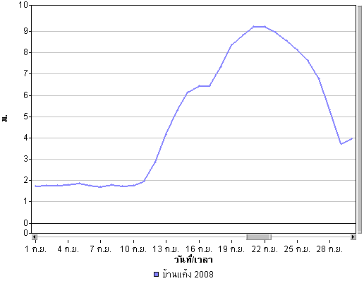 | จากภาพแผนที่อากาศกรมอุตุนิยมวิทยา พบว่ามีร่องความกดอากาศต่ำหรือร่องฝน พาดผ่านพื้นที่ประเทศไทยตลอดทั้งเดือน โดยในช่วงต้นเดือนตั้งแต่วันที่ 1 ก.ย. จนถึงวันที่ 5 ก.ย. ร่องความกดอากาศได้พาดผ่านบริเวณภาคเหนือและภาคตะวันออกเฉียงเหนือ ทำให้บริเวณดังกล่าวมีฝนตกค่อนข้างมาก หลังจากนั้นร่องความกดอากาศต่ำได้ลดต่ำลงพาดผ่านบริเวณตอนกลางของประเทศทำให้พื้นที่ภาคกลางและภาคตะวันออกมีฝนหนัก และทำให้มีน้ำท่วมในหลายพื้นที่ของภาคกลางและภาคตะวันออก เ่ช่น จังหวัดลพบุรี นครนายก ปราจีนบรุี นอกจากนี้จะเห็นว่าในช่วงปลายเดือนได้มีพายุ "เมฆขลา" ค่อย ๆ เคลื่อนตัวเข้าสู่พื้นที่ประเทศไทยทางด้านตะวันออก เป็นผลทำให้ีมีฝนตกหนักและทำให้ปริมาณน้ำเพิ่มสูงขึ้นอีกครั้งและไหลเข้าท่วมในหลายพื้นที่ของภาคตะวันออกและภาคตะวันออกเฉียงเหนือ ดูรายละเอียดเพิ่มเติม |