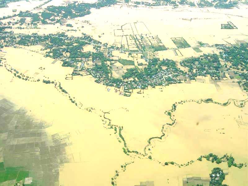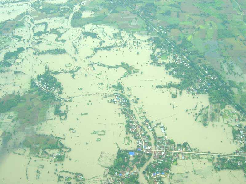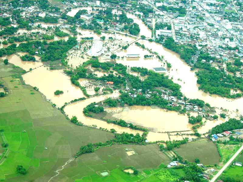 ภาพน้ำท่วมจากการบินถ่ายทางอากาศ เมื่อวันที่ 11 กันยายน 2545 พบพื้นที่น้ำท่วมเป็นปริมาณกว้างโดยขยายวงกว้างจากริมแม่น้ำ และบางส่วนเข้าท่วมเขตตัวเมือง