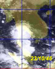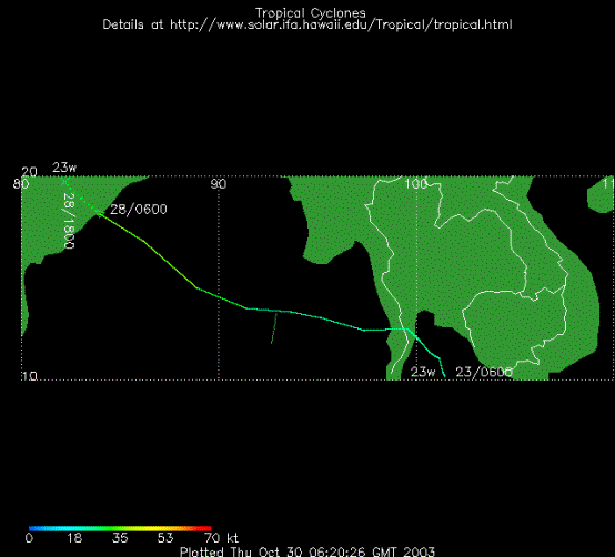 แผนที่วิเคราะห์เส้นทางและความแรงของพายุ จัดทำโดย มหาวิทยาลัยฮาวาย จากรูปแสดงเส้นทางของพายุดีเปรสชั่น 23W ที่พาดผ่านประเทศไทยและขึ้นฝั่งมี่จังหวัดเพชรบุรีในวันที่ 23 ตุลาคม 2546 ส่งผลให้จังหวัดเพชรบุรีและบริเวณภาคใต้ตอนบนมีฝนตกหนัก เกิดน้ำท่วมฉับพลันและน้ำป่าไหลหลากได้ในพื้นที่ลุ่มและพื้นที่เสี่ยงภัย โดยเฉพาะบริเวณจังหวัดเพชรบุรี ประจวบคีรีขันธ์ ชุมพร และสุราษฎร์ธานี