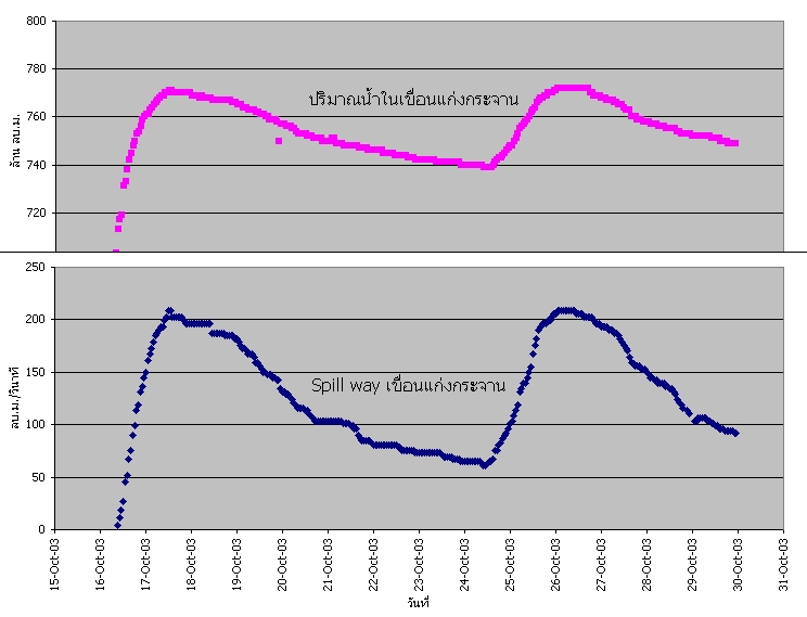 เขื่อนแก่งกระจาน จากรูปกราฟแสดงข้อมูลปริมาณน้ำในเขื่อนแก่งกระจาน จะพบว่าช่วงเดือนตุลาคม 2003 มีปริมาณน้ำสูง แบ่งเป็น 2 ช่วง คือ