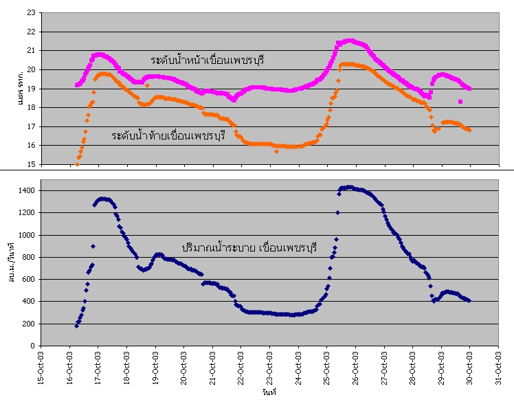 จากรูปกราฟแสดงข้อมูลระดับน้ำหน้าเขื่อน ระดับน้ำท้ายเขื่อน และปริมาณน้ำระบาย พบว่ามีค่าสูงขึ้นมาก ทั้ง 2 ช่วงเช่นเดียวกัน โดยเฉพาะในวันที่ 26 ตุลาคม มีระดับน้ำหน้าเขื่อน สูงถึง 21.5 เมตร รทก. โดยมีการเร่งระบายน้ำตั้งแต่วันที่ 24 ตุลาคม