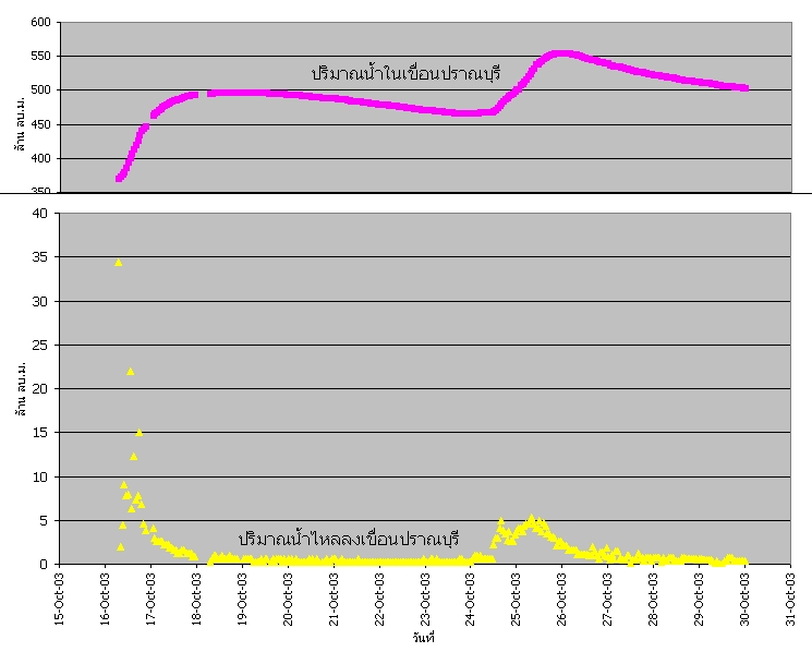 เขื่อนปราณบุรี จากรูปกราฟแสดงข้อมูลปริมาณน้ำในเขื่อนปราณบุรี จะพบว่าในช่วงแรกมีปริมาณน้ำไหลเข้าเขื่อนสูงสุดถึง 34 ล้าน ลบ.ม. ในวันที่ 16 ตุลาคม ทำให้ปริมาณน้ำในเขื่อนเพิ่มขึ้นอย่างรวดเร็ว และเมื่อช่วงที่ 2 เมื่อมีฝนตกหนัก แม้นว่าจะมีปริมารน้ำไหลเข้าเขื่อนไม่เกิน 5 ล้าน ลบ.ม. ต่อวัน แต่เนื่องจากเขื่อนได้รับน้ำของเดิมไว้มาก จึงทำให้ปริมาณน้ำในเขื่อนเพิ่มมากขี้นสูงสุดถึง 560 ล้าน ลบ.ม. ในวันที่ 26 ตุลาคม