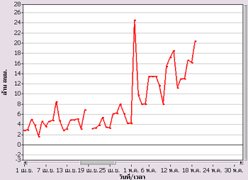 จากแผนภาพฝนสะสมของ NASA พบว่าเริ่มมีกลุ่มฝนกระจุกตัวบริเวณภาคเหนือตั้งแต่วันที่ 8 พ.ค. และในช่วงวันที่ 9-10 พ.ค. มีกลุ่มฝนกระจุึกตัวค่อนข้างมากต่อเนื่องสองวัน ส่งผลให้เกิดน้ำท่วมฉับพลันบริเวณจังหวัดลำปาง ลำพูน พะเยา แพร่ และในวันที่ 11 พ.ค.กลุ่มฝนได้สลายตัวไป |