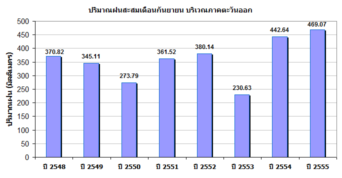 | รายละเอียดเพิ่มเติม : http://www.thaiwater.net/DATA/REPORT/php/rid_bigcm.html ช่วงเดือนกันยายน มีฝนตกค่อนข้างมากในพื้นที่ภาคตะวันออก ส่งผลให้ปริมาณน้ำไหลลงอ่างเก็บน้ำขนาดใหญ่ในพื้นที่ภาคตะวันออกเพิ่มขึ้นค่อนข้างมาก โดยเฉพาะอ่างเก็บน้ำคลองสียัดและอ่างเก็บน้ำประแสร์ ที่ปริมาณน้ำกักเก็บเกินระดับกักเก็บสูงสุด |